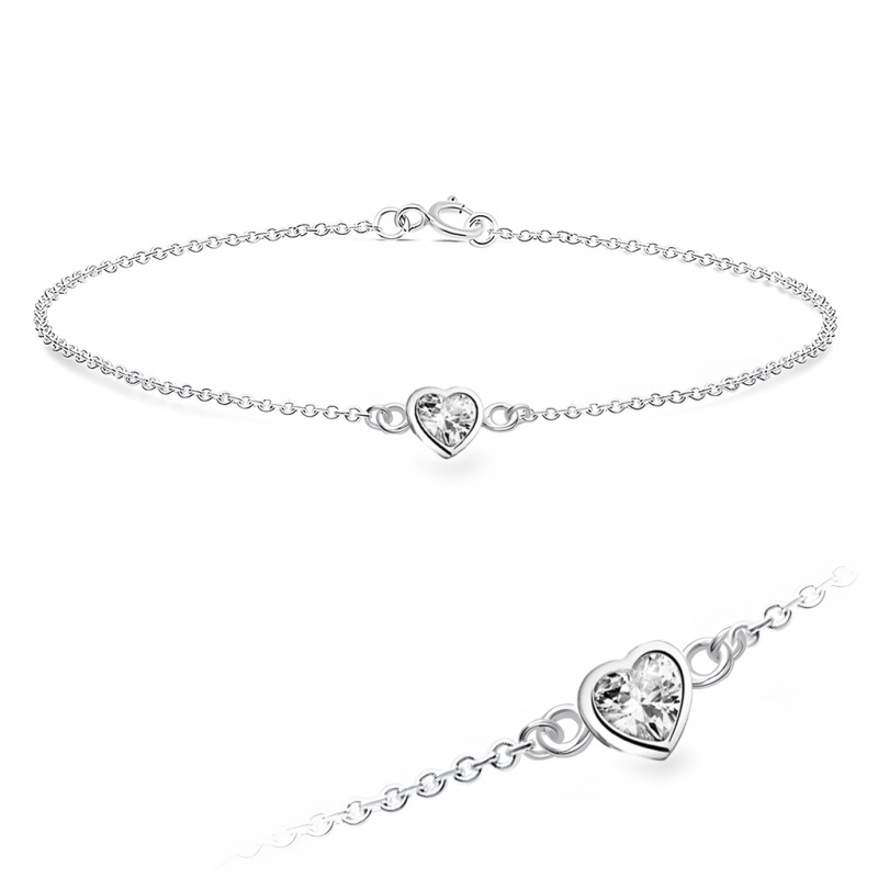 W tej bransoletce najważniejszy jest jeden, mały punkt w centrum: cyrkonia w kształcie serduszka, osadzona w gładkiej oprawie. Kamień ma wyraźny szlif a gładka oprawa podkreśla kształt serca i trzyma całość w delikatnym tonie. Wszystkie elementy bransoletki wykonano ze srebra próby 925 (łańcuszek, oprawa, zapięcie).