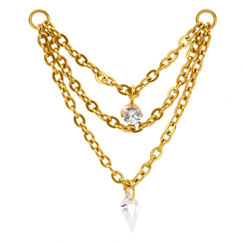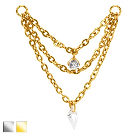 Ten potrójny łańcuszek buduje swoją moc jak naturalna formacja: najwyższy niesie okrągły kryształ przywodzący na myśl górski minerał, środkowy tworzy subtelne przejście, a najniższy zakończony jest geometrycznym sopelkiem. To potrójne doładowanie: każda warstwa wzmacnia następną. Złoty odcień nadany dzięki powłoce PVD idealnie zgra się z ciepłymi kolczykami, a srebro podkreśli chłodne stylizacje.