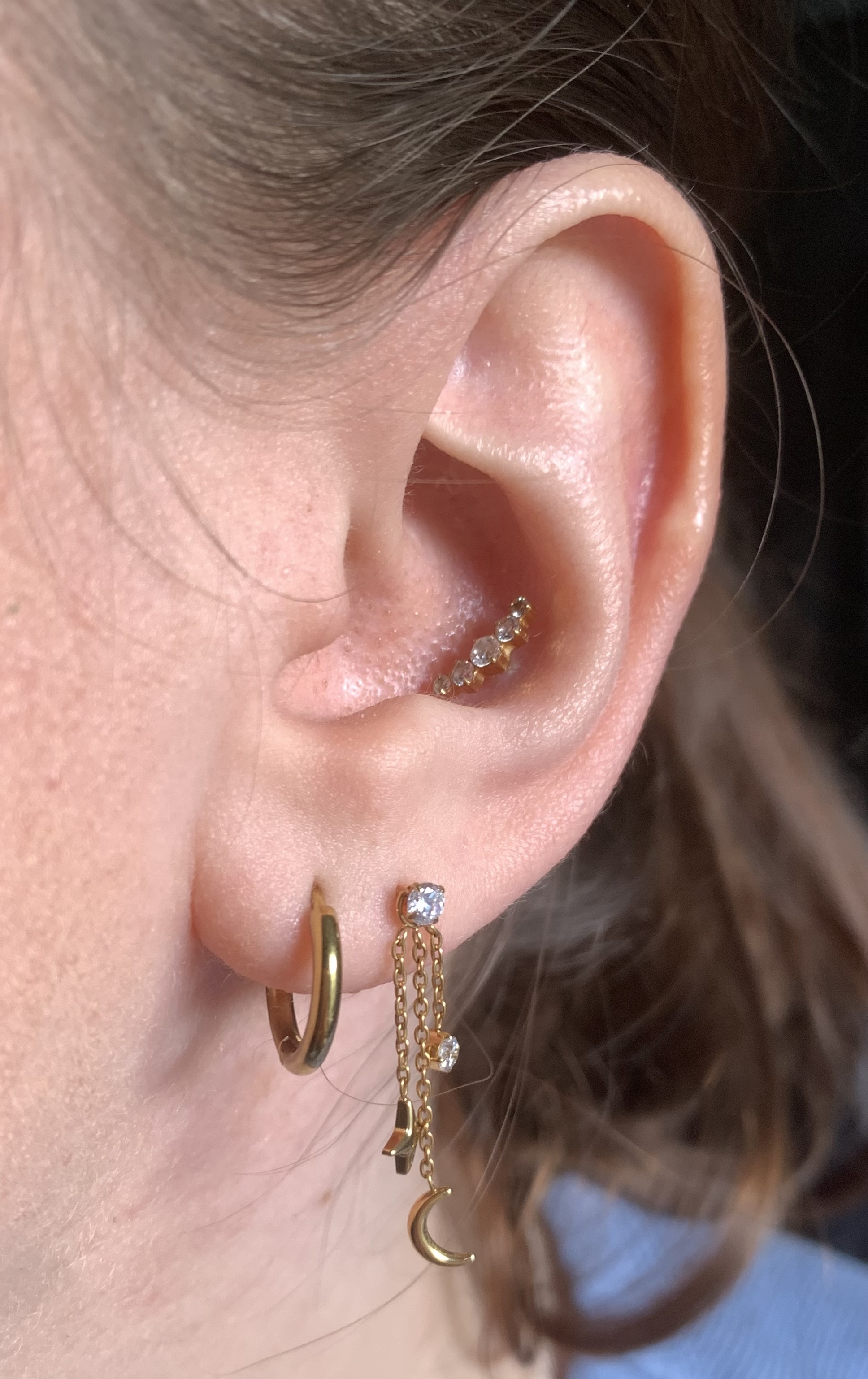 Zawieszka księżyc z gwiazdką i kryształkiem wygląda jak miniatura nocnego nieba zawieszona przy Twoim kolczyku – delikatne ogniwa prowadzą od kółeczka aż do księżyca, gwiazdki i błyszczącego kryształka. Całość została wykonana z tytanu G23, dzięki czemu łańcuszek jest lekki, wytrzymały, odporny na codzienne użytkowanie i jednocześnie delikatny dla skóry, więc możesz nosić go na co dzień bez obaw.