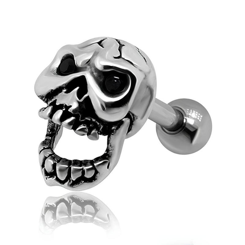 Motyw czaszki z ruchomą szczęką działa jak mały artefakt wyjęty z katakumb: niby drobiazg, a buduje klimat jak pierwszy takt mrocznego soundtracku. Chłodny, srebrzysty połysk ozdoby (imitacja srebra) zgrywa się z czernią, skórą i denimem, ale też przewrotnie kontruje pastelowe bluzy. Baza kolczyka to stal chirurgiczna 316L, ceniona za trwałość, odporność na korozję i wysoki połysk — solidna na co dzień.
