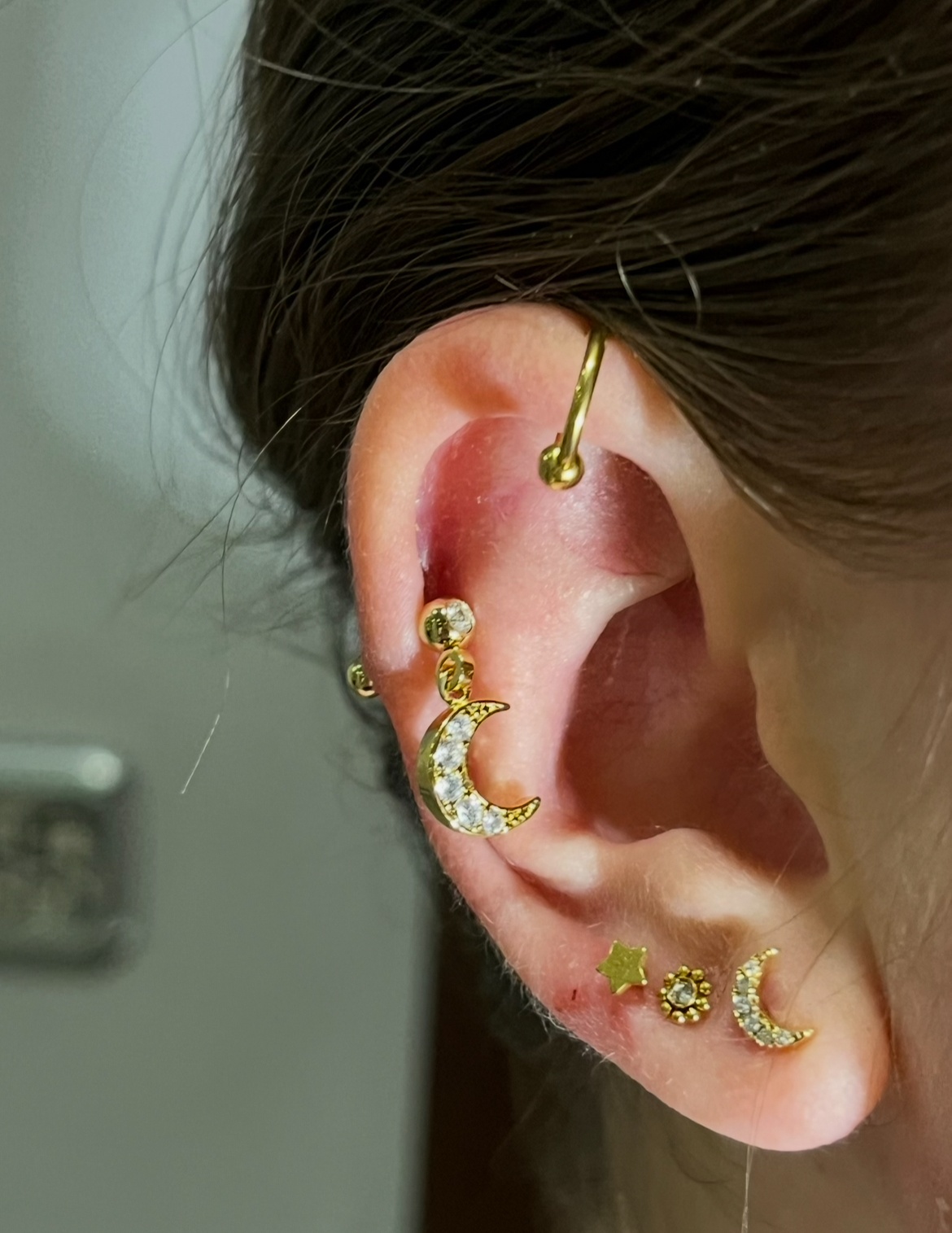 Ten kolczyk przyciąga wzrok dzięki swojej formie – wiszący półksiężyc wygląda tak, jakbyś nosił przy uchu kawałek nocnego nieba. To motyw, który od wieków symbolizuje tajemnicę, energię i urok, a w biżuterii zyskuje nowoczesne i subtelne oblicze. Pręt i kulka wykonane zostały ze stali chirurgicznej 316L, która gwarantuje połysk i trwałość, a ozdoba z mosiądzu sprawia, że detale są dopracowane i stabilne.