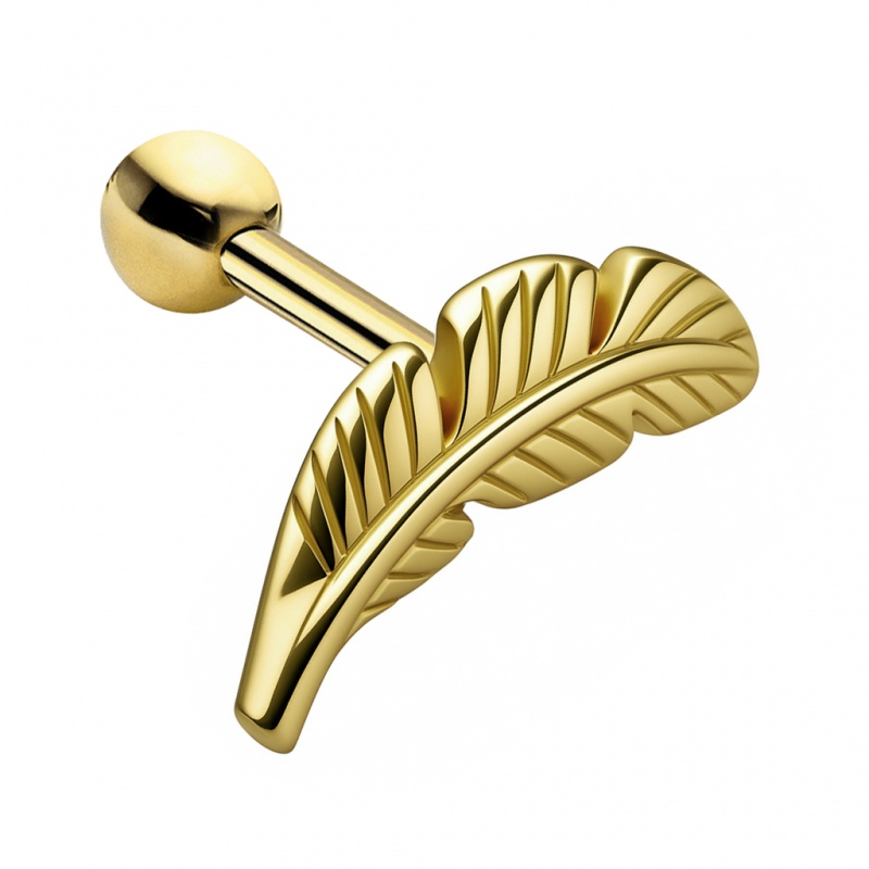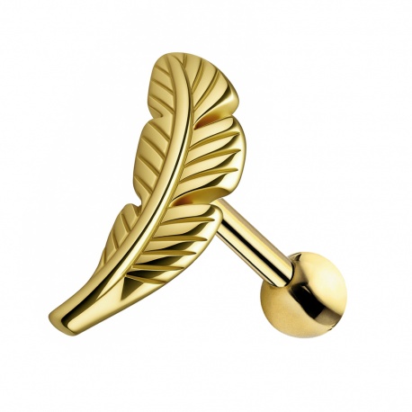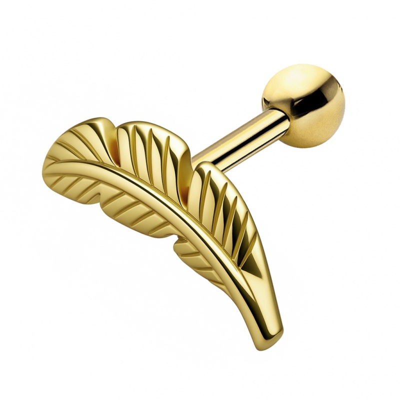 Kolczyk na lewe lub prawe ucho z ozdobą w kształcie wygiętego piórka. Pręt i kulka wykonane ze stali chirurgicznej, ozdoba ze srebra (próba 925) - kolor uzyskany dzięki powłoce PVD.