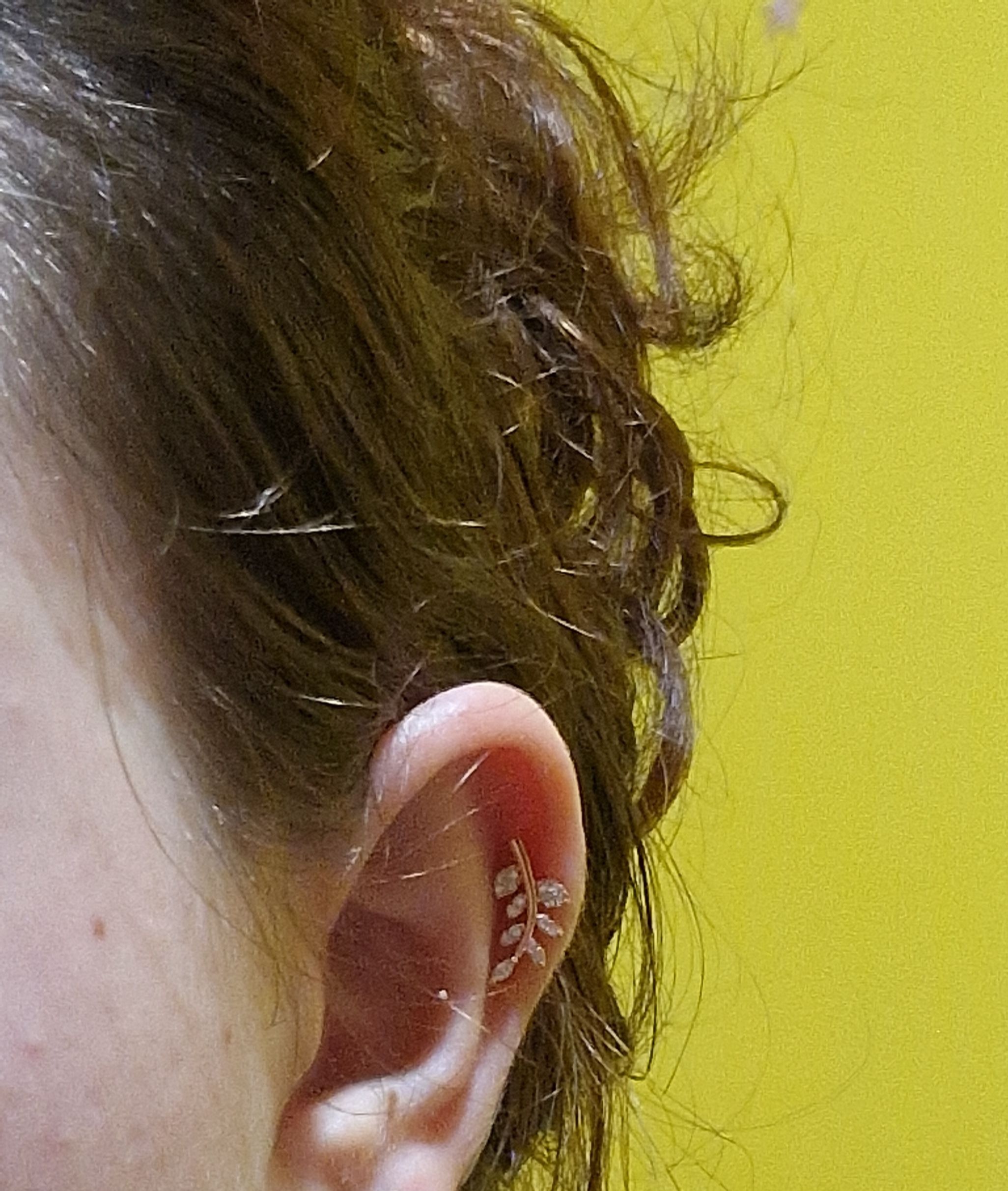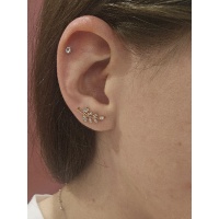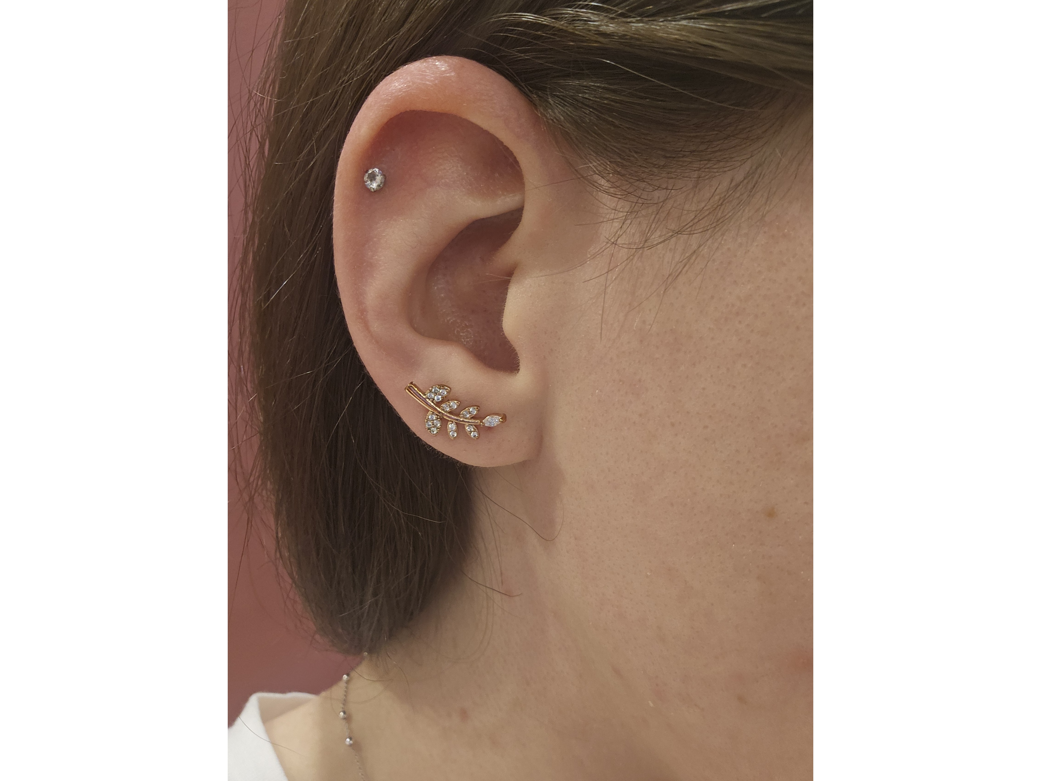 Ten kolczyk to mały symbol natury przeniesiony do świata piercingu. Listek ozdobiony kryształkowym połyskiem wygląda tak, jakby złapał promień słońca i zatrzymał go tylko dla Ciebie. Pręt i kulka wykonane ze stali chirurgicznej 316L nadają mu trwałości i gładkiego blasku, a mocowanie ozdoby z mosiądzu gwarantuje precyzyjne detale.
