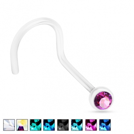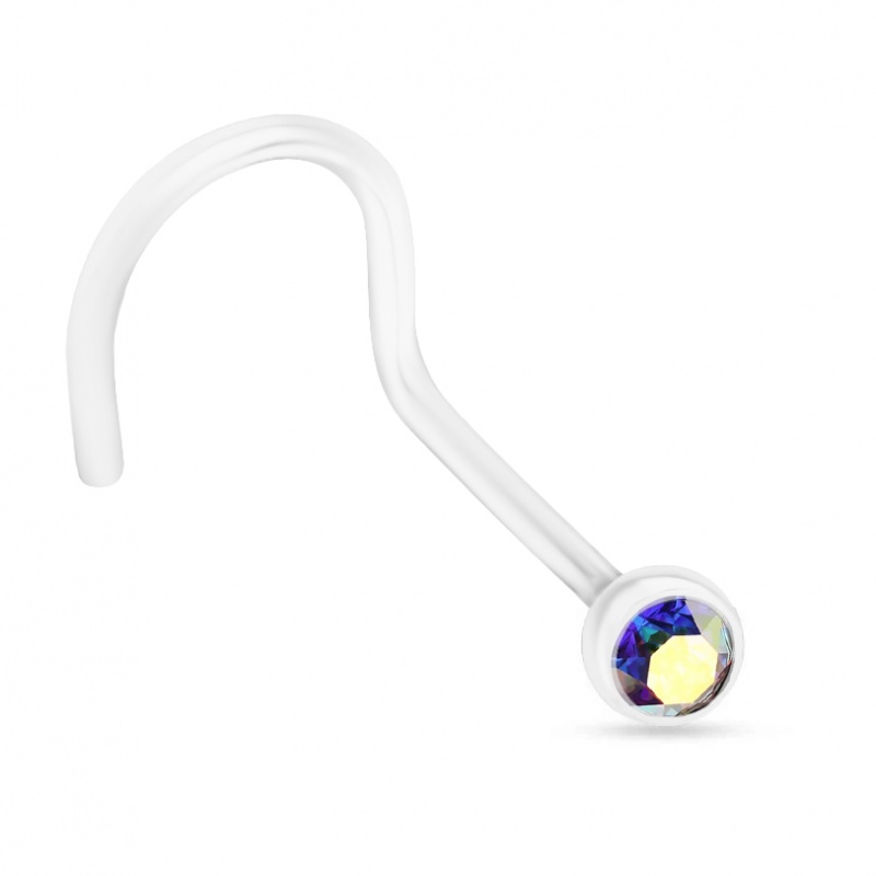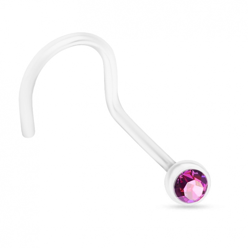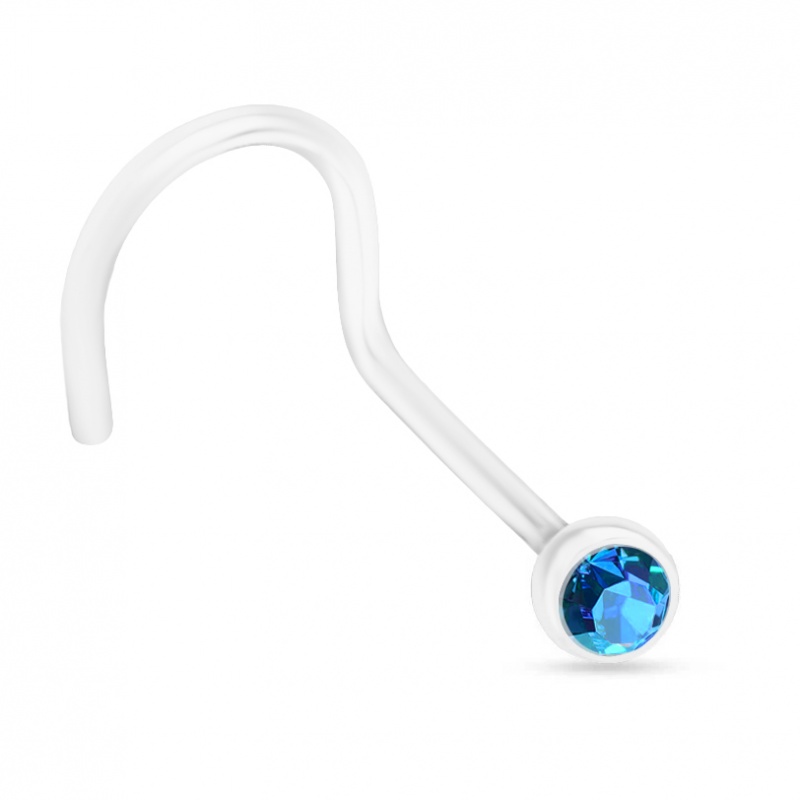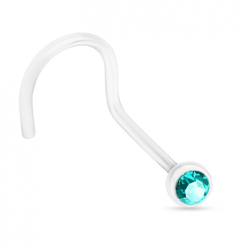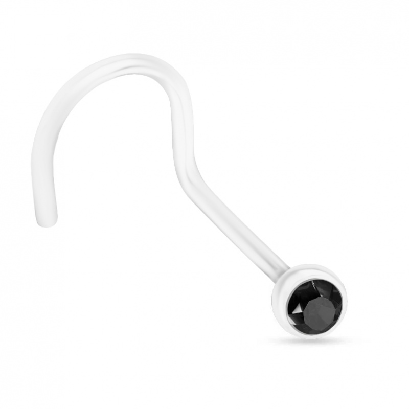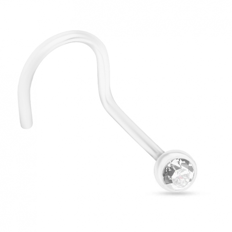 Ten zakręcony kolczyk do nosa łączy wygodę z subtelnym blaskiem. Wyprofilowany łuk lekko zakotwicza się w kanale przekłucia i trzyma się tak pewnie, jak guzik w ulubionej kurtce, a zaokrąglona końcówka nie drażni skóry. Rdzeń kolczyka wykonano z Bioplastu®, czyli nowoczesnego, elastycznego polimeru przyjaznego świeżym przekłuciom. Materiał jest lekki, gładki i bez niklu, dlatego minimalizuje ryzyko podrażnień.
