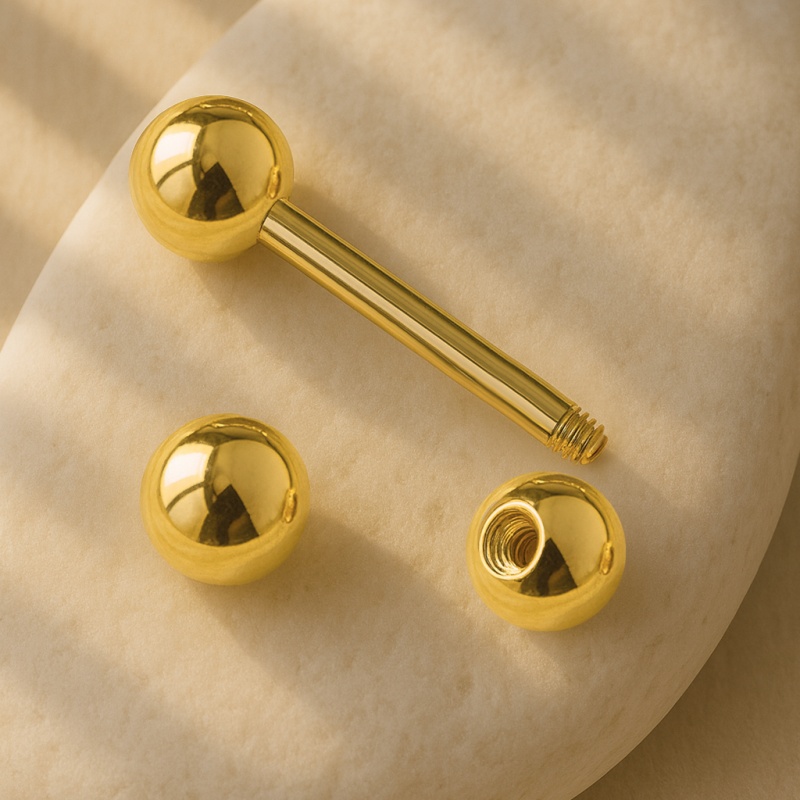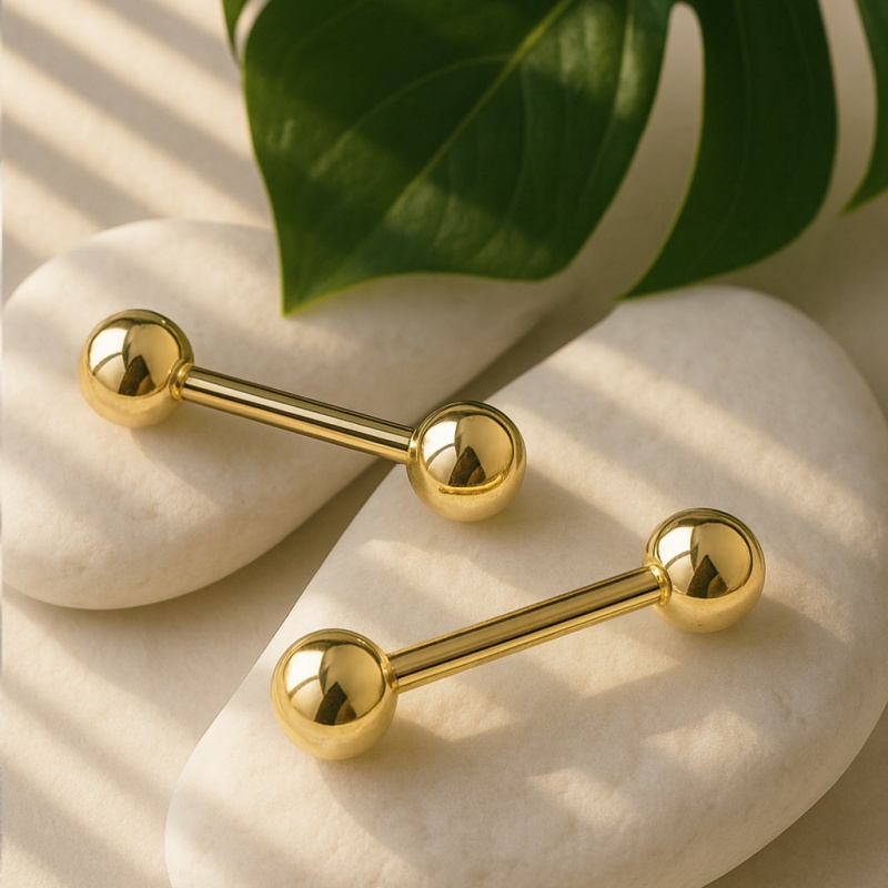 Kolczyk do sutka wykonany ze złota 14K (próba 585) łączy prostą linię z wyważonym blaskiem, który dyskretnie podkreśla miejsce przekłucia. Gładkie wykończenie sprawia, że powierzchnia pracuje ze światłem równomiernie. Forma jest oszczędna, ale dopracowana — tu liczy się proporcja, czystość konturu i konsekwencja. Konstrukcja została zaprojektowana z myślą o codziennym komforcie: element dobrze układa się na skórze, a pewne zapięcie (gwint zewnętrzny) oraz wygodne zakładanie dają poczucie kontroli. Złoty odcień zachowuje spokojny charakter i nie konkuruje z resztą stylu; to akcent, który ma „być na miejscu”, nie na pierwszym planie.
