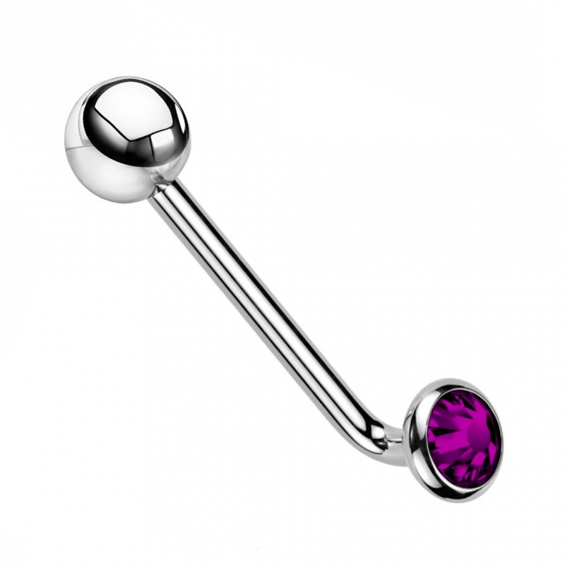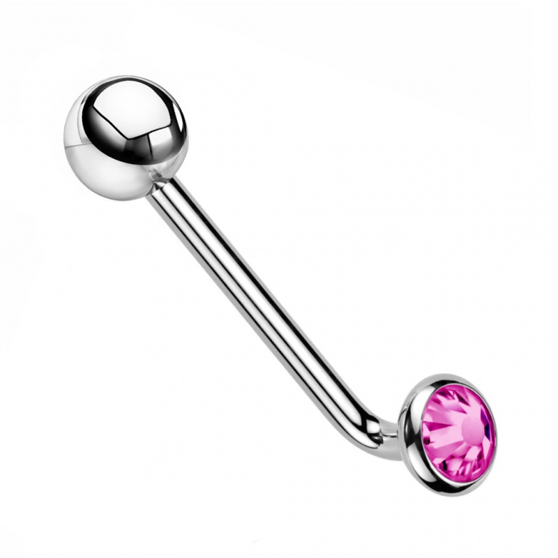 Kolczyk dostępny jest z kryształkiem w trzech kolorach: clear (klasyczny), różowym oraz fioletowym. Do wyboru masz także dwa warianty kolorystyczne pręta: srebrny oraz złoty, uzyskany dzięki trwałej powłoce PVD, a prosty kształt L-bar sprawdzi się u osób szukających dyskretnego, funkcjonalnego modelu do codziennego noszenia.