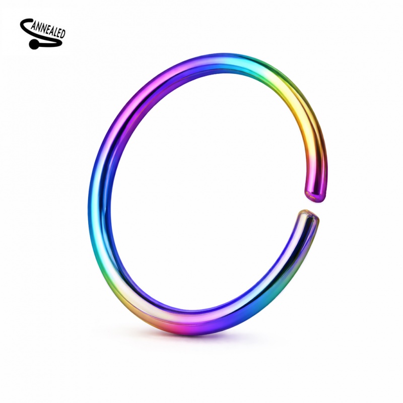 Rozginane kółko ze stali chirurgicznej 316L dostępne jest w trzech wyrazistych odsłonach: głębokiej czerni, klasycznym złocie oraz energetycznym tęczowym gradientem uzyskanymi dzięki powłoce PVD. Ten sprawdzony stop zachowuje gładką powierzchnię i odporność na korozję, a podrażnienia skóry zdarzają się w nim równie rzadko, co dni bez scrollowania w socialach.