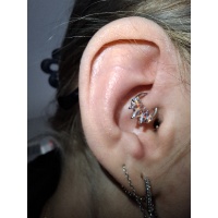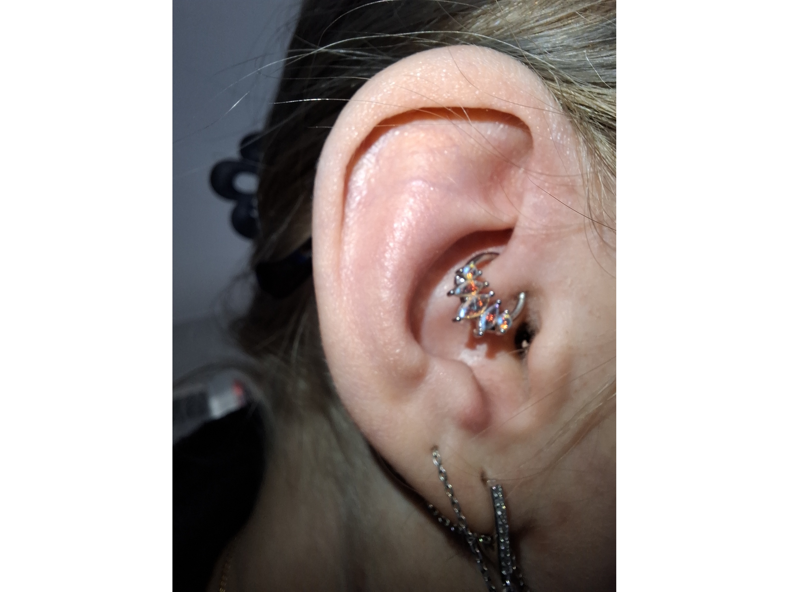 Kółko kolczyka owszem jest zrobione ze stali chirurgicznej, ale niestety mocowanie kryształków nie. Po czasie zmienia kolor na różowy i brudzi się i skórę na zielono. Nie polecam nosić go jako kolczyk daith, nie jest się w stanie wyczyścić go na 100%. :(