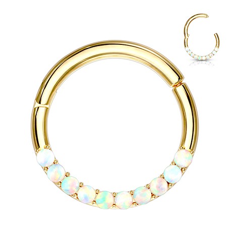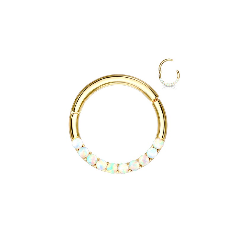 Najpierw widać kolor — pas syntetycznych opali układa się jak starannie zestawiona paleta: od mlecznych bieli, przez chłodne błękity, po delikatne różowe półtony, ustawione w równy rząd, który tworzy na froncie jednolity akcent. Kolczyk ze złota 14K (próba 585), którego ciepły ton nadaje tym barwnym punktom głębi i elegancji. Zapięcie clicker działa dyskretnie: segment prowadzi się po łuku i zamyka krótkim kliknięciem wyczuwalnym pod palcem, co przekłada się na pewne zapięcie i komfort noszenia.