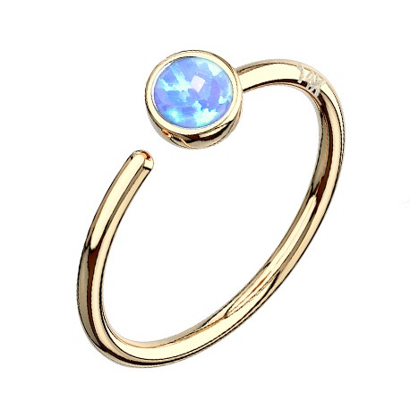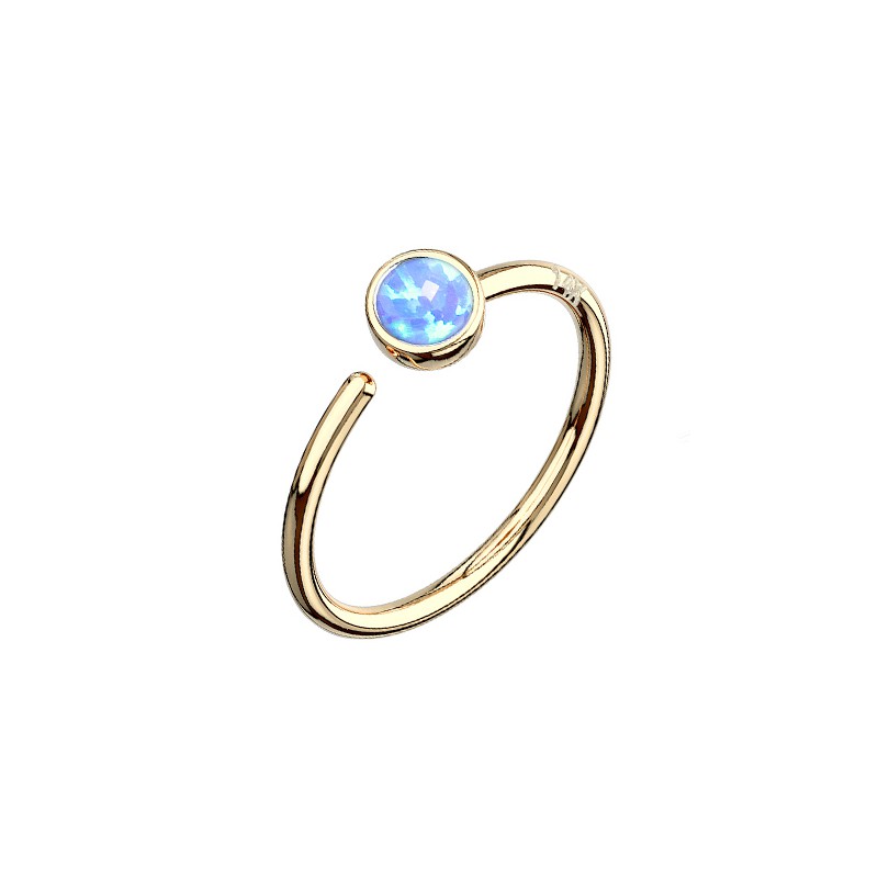 Smukła obręcz wyznacza czystą linię, a punktem skupienia jest błękitny syntetyczny opal o delikatnej, mieniącej się poświacie. Kółko wykonano ze złota 14K (próba 585) — ciepły odcień kruszcu podkreśla staranne polerowanie i nadaje formie dojrzały charakter. Rozginany kolczyk działa pewnie: jeden płynny ruch, zakładasz i wracasz do osi, zyskując pewne zapięcie i komfort noszenia przez cały dzień.