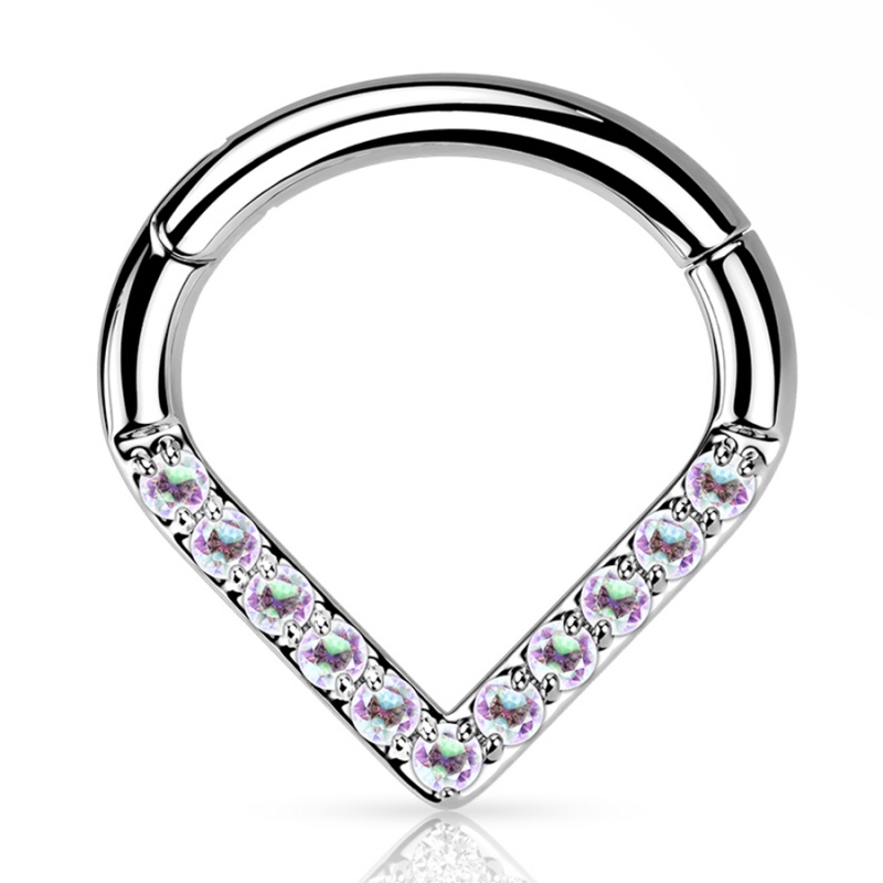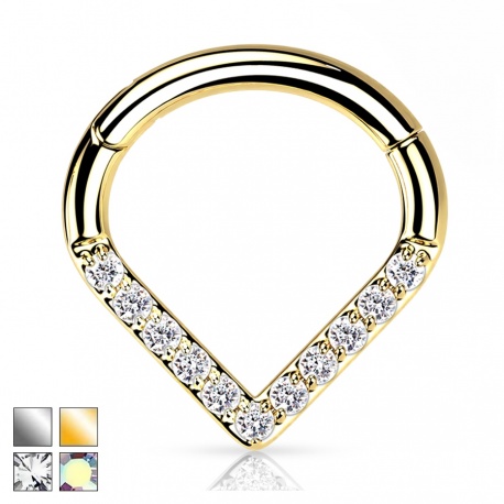 Stylowy trójkątny clicker wykonany z tytanu G23, ozdobiony rzędem lśniących kryształków. Dostępny w kolorze srebrnym oraz w eleganckiej odsłonie złotej, uzyskanej dzięki trwałej powłoce PVD. Ozdoby występują w wersji kryształowej lub opalizującej. Wygodny mechanizm clicker zapewnia szybkie i pewne zapinanie, łącząc funkcjonalność z subtelnym blaskiem.