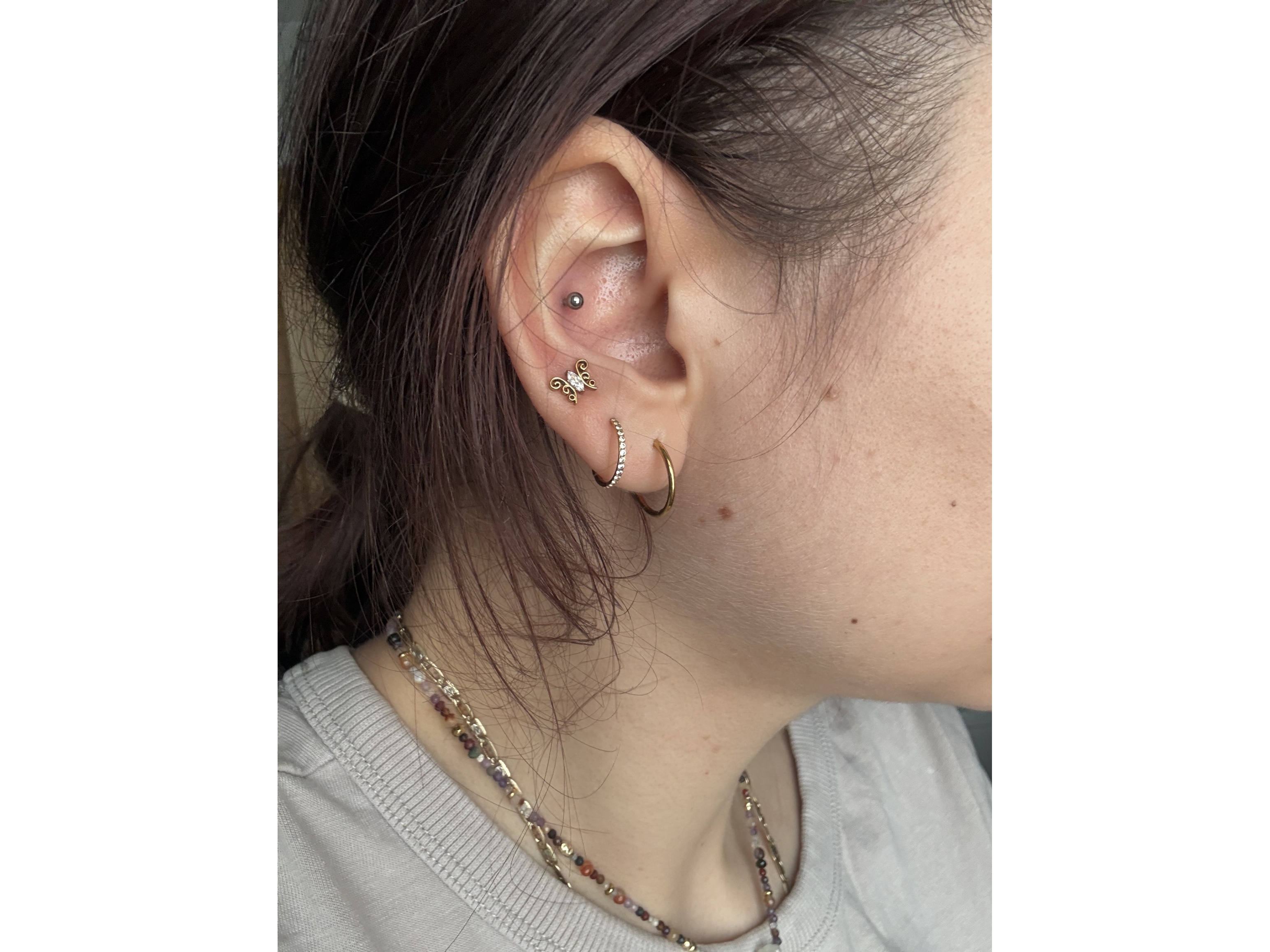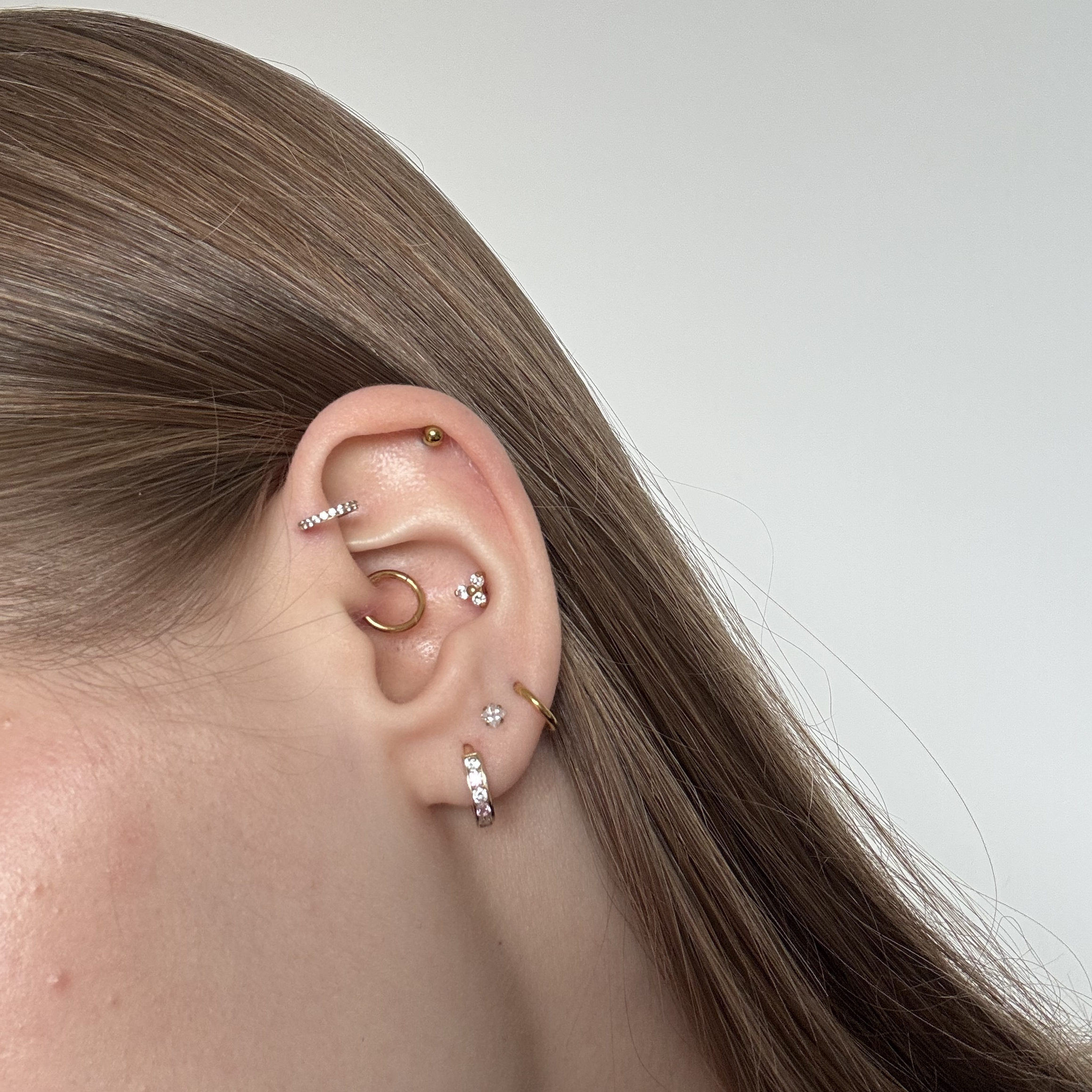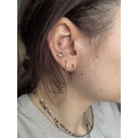 Marzysz o dodatku, który błyszczy jak złoto z Twojego feedu, a jednocześnie nie ciąży w uchu? Ten clicker spełnia oba warunki i idealnie sprawdzi się w przekłuciach jak helix, conch czy nostril. Kolczyk równie dobrze zagra w klasycznych przekłuciach uszu (lobe, upper lobe), a także w rooku, tragusie czy nawet wardze — jego materiał to tytan G23, lekki i przyjazny dla skóry, więc możesz nosić go non stop bez stresu. Ciepły kolor zawdzięcza powłoce PVD, która otula kółko trwałym, głębokim złotem i nie ściera się podczas codziennych przygód.