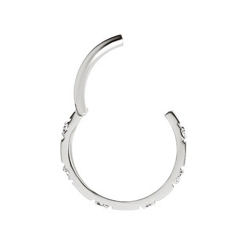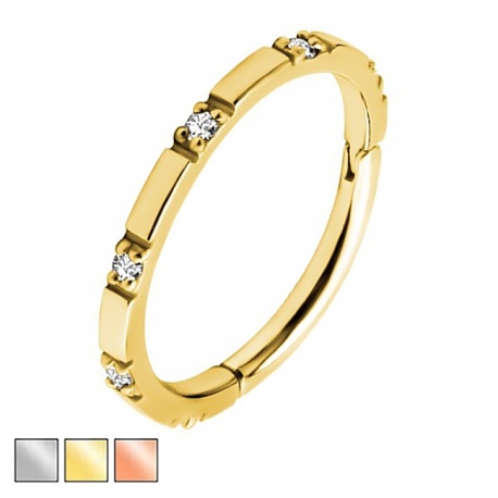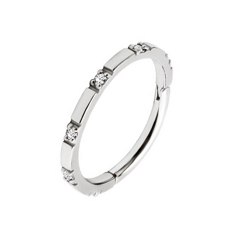 To kółko łączy czystą geometrię z delikatnym błyskiem – prostokątne segmenty tworzą rytm, między którym migoczą drobne kryształki. Wykonane ze stali chirurgicznej 316L, zachwyca wysoką trwałością i odpornością na korozję, a gładka powierzchnia odbija światło tak, że trudno oderwać wzrok. Zapięcie clicker to szybki, pewny „klik” i gotowe – idealnie, kiedy rano brakuje czasu albo chcesz zmienić biżuterię w biegu.