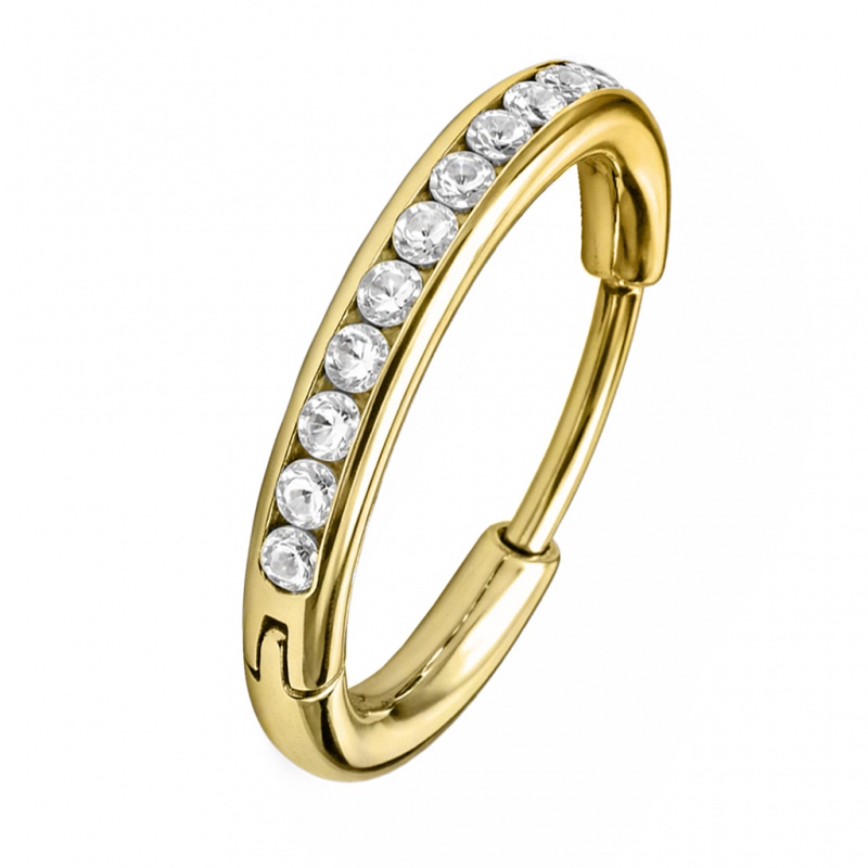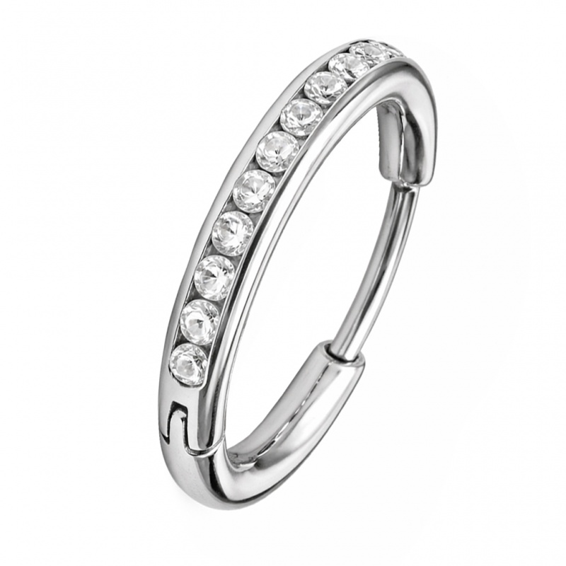 W tym kółku clicker kryształki są wpuszczone w rant obręczy – jak w oprawie pierścionka – więc całość zostaje gładka, bez wystających krawędzi. To rozwiązanie przypomina kanałową oprawę w obrączce — detal jest częścią metalu, a nie osobną warstwą, dlatego mniej zahacza o włosy czy tkaniny. Kolczyk wykonano z tytanu G23 – trwałego i delikatnego dla skóry materiału, który dobrze znosi codzienne noszenie.