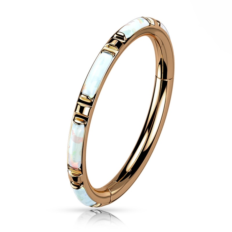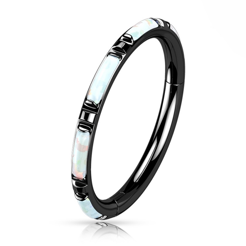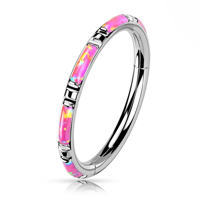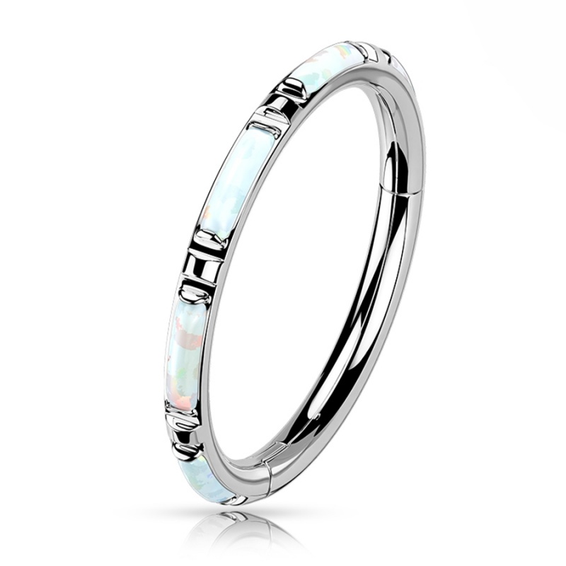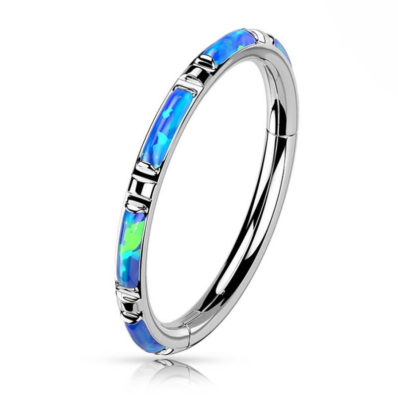 W tym clickerze opal nie biegnie obok formy, ale dokładnie za nią nadąża. Podłużna ozdoba została osadzona w linii kółka, dzięki czemu całość ma płynny, spójny układ. Syntetyczny opal jest odcieniu mlecznej bieli, chłodnego błękitu i różu, trochę jak tafla szkła, na którą pada światło pod innym kątem.