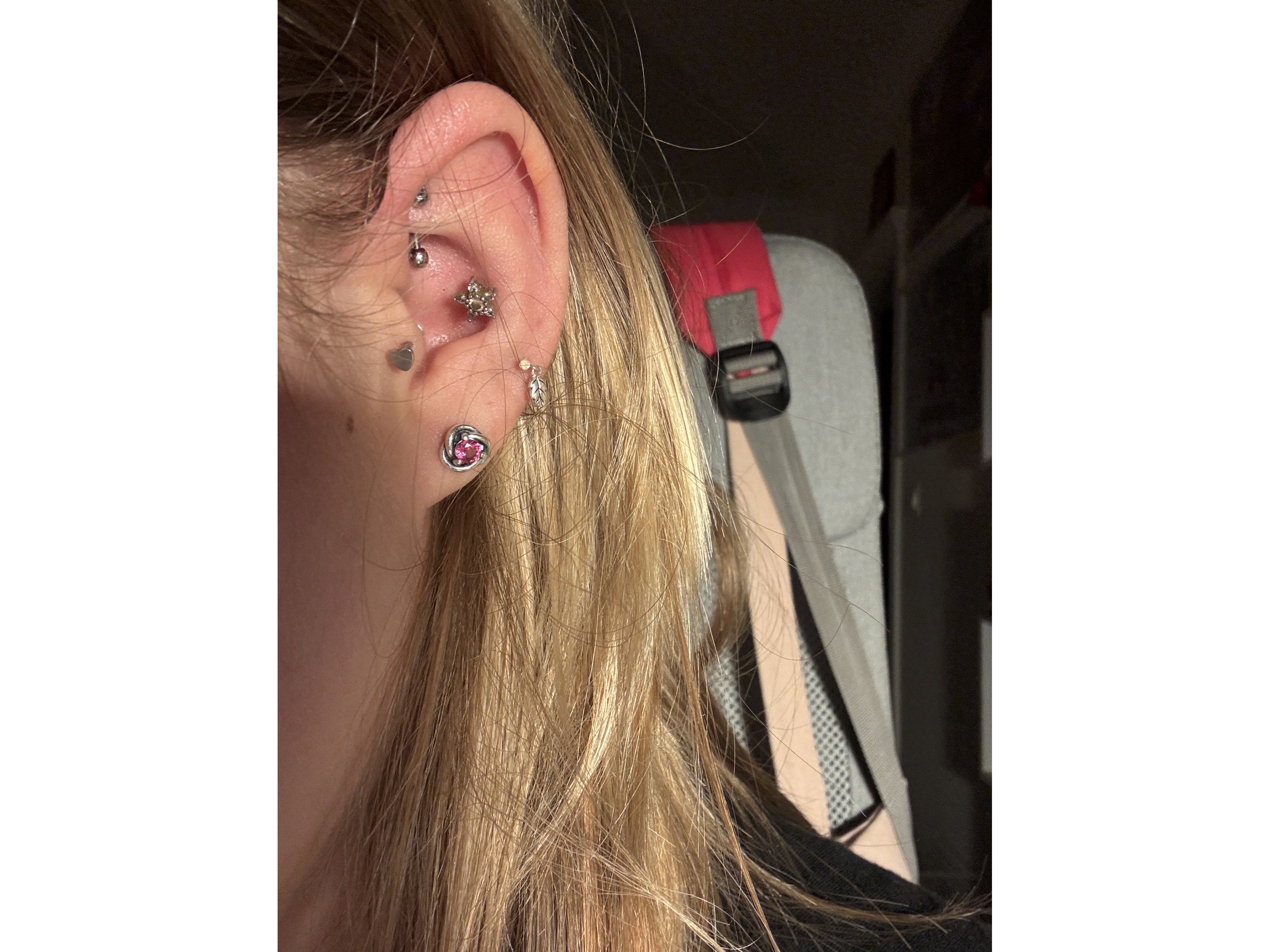 Pręt sprawia, że przy przekłuciu widać głównie delikatny listek i błysk kryształka – jak liść, który zamiast trzymać się gałęzi, zaczepił się o ucho. Wisząca ozdoba lekko buja się przy ruchu głowy, trochę jak liść złapany przez podmuch wiatru między blokami. Pręt z bioflexu jest lekki, elastyczny i łagodny dla skóry, dzięki czemu dobrze współpracuje z przekłuciem podczas noszenia.