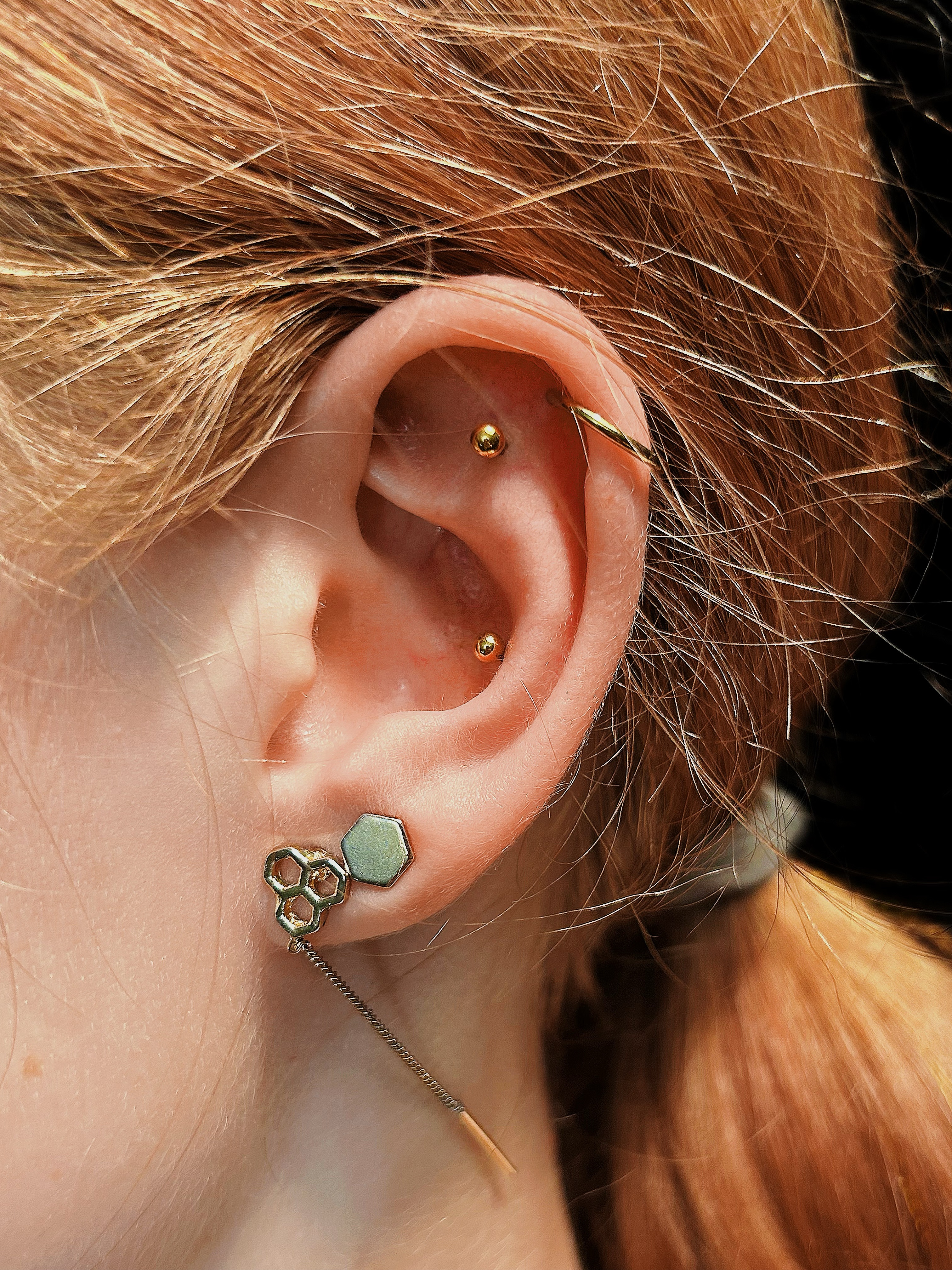 | Materiał | Tytan G23 - Ze względu na swoje właściwości medyczne często wykorzystywany jest do produkcji urządzeń medycznych (zastawki serca), czy protez ludzkiego ciała. Z tego względu jest również jednym z najlepszych materiałów do produkcji biżuterii. Zgodnie z dyrektywą unijną (Nickel Directive) kolczyki z tytanu są szczególnie polecane do świeżego przekłucia oraz osobom posiadającym uczulenie na nikiel. |