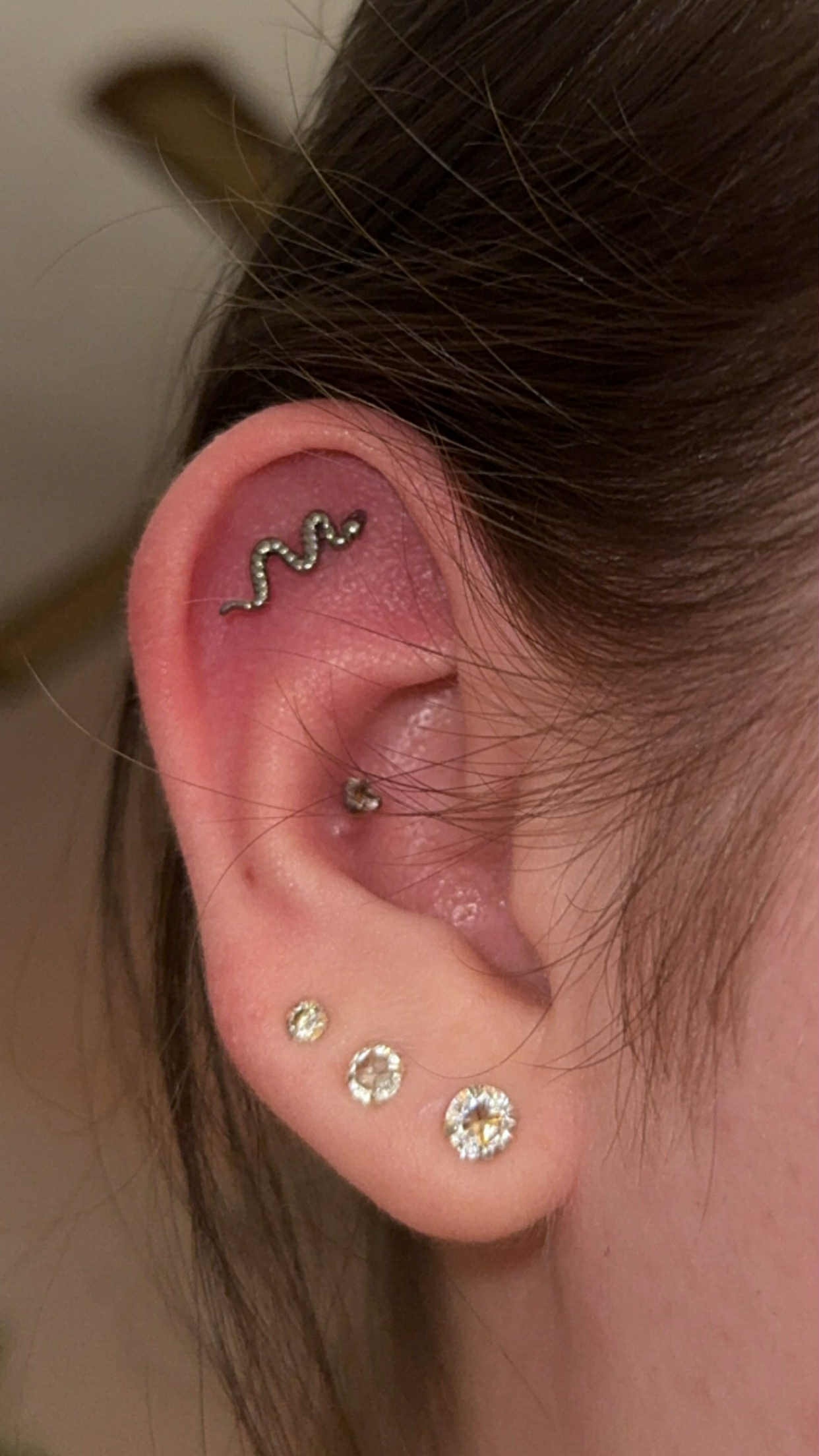 Ukryty gwint wewnętrzny sprawia, że montaż jest bezproblemowy, a płaski dysk od wewnątrz dba o stabilność niczym zatrzask w luksusowej bransoletce – kolczyk nie przesuwa się, nie uwiera, a Ty możesz zapomnieć, że go nosisz. Motyw węża dodaje stylizacji nuty mistycyzmu i śmiałości, świetnie komponując się z jeansową kurtką. Postaw na węża – mały symbol siły i tajemnicy, który w minimalistyczny sposób podkreśli Twoją indywidualność.