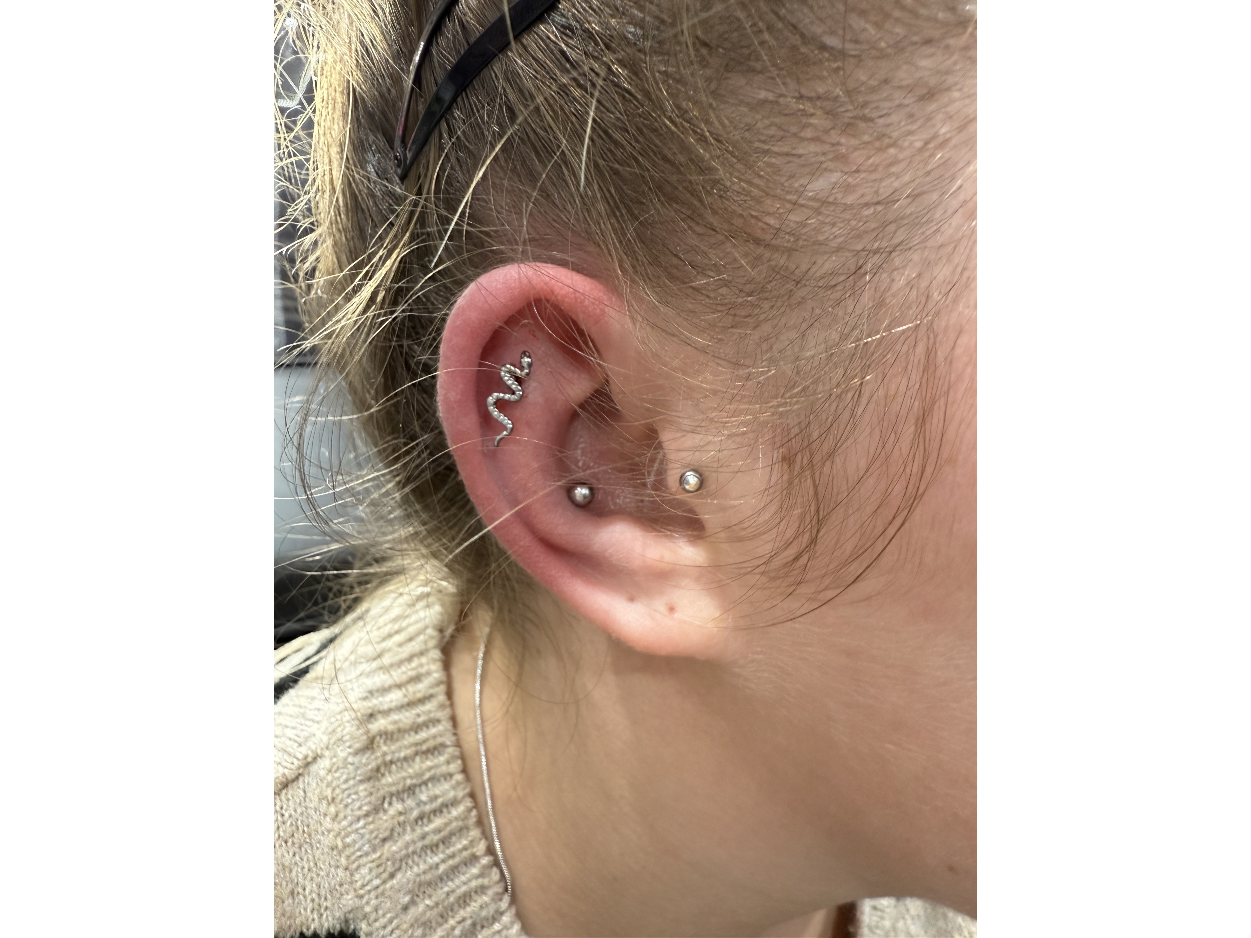 Spiralne ciało gada spoczywa na końcu pręta niczym delikatny łańcuszek ułożony na nadgarstku. Zdobienie ma subtelny, srebrzysty połysk tytanu, a w złotej lub czarnej wersji z powłoką PVD zyskuje drapieżny charakter. Wykonany z tytanu G23, materiału gładkiego i odpornie wytrzymałego, labret pozostaje lekki i nie odkształca się nawet przy intensywnym stylu życia.