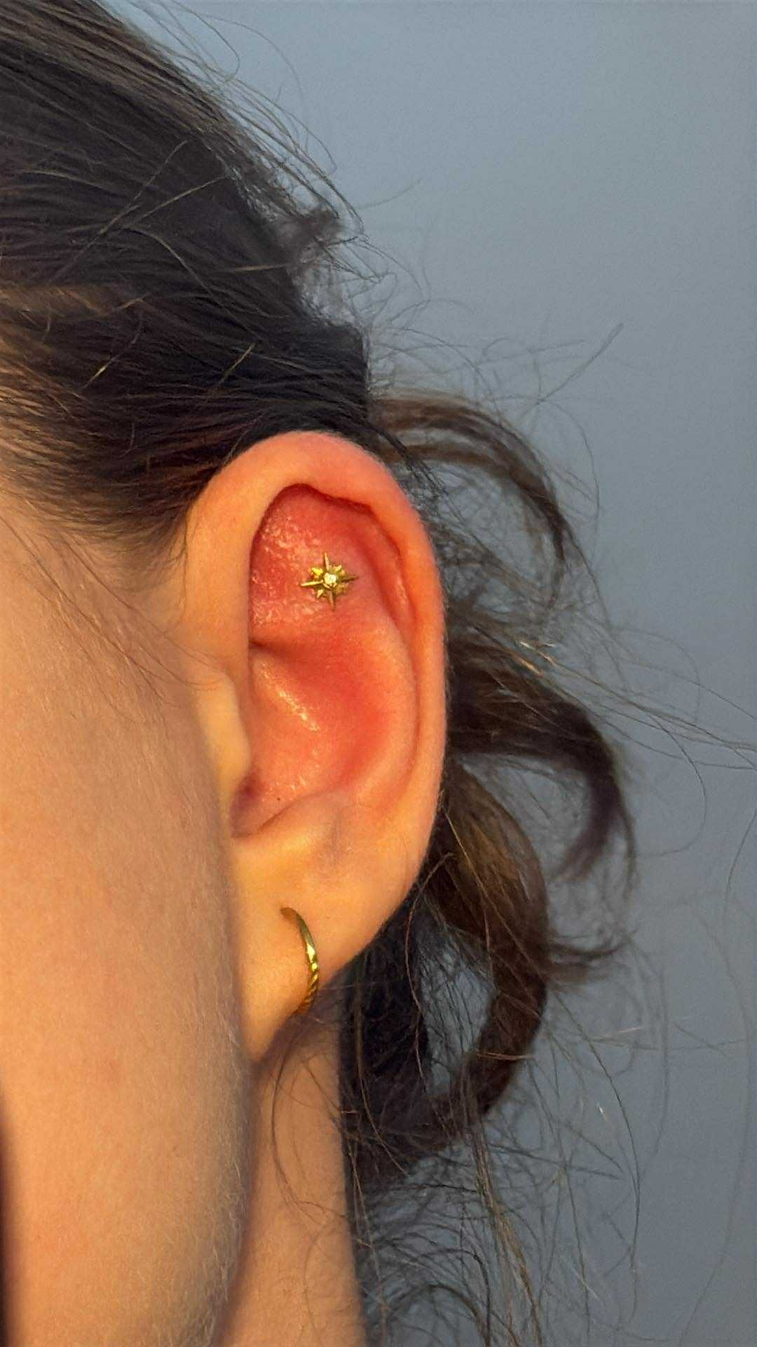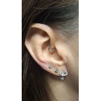 Ośmioramienna gwiazdka z 1 mm kryształkiem działa jak mała Gwiazda Polarna – ustawiasz ją w uchu i od razu wiadomo, gdzie patrzeć. Nakrętka siedzi na trzonie z tytanu G23, który łączy trwałość i łagodność dla skóry, więc to biżuteria na co dzień, bez zbędnego kombinowania.