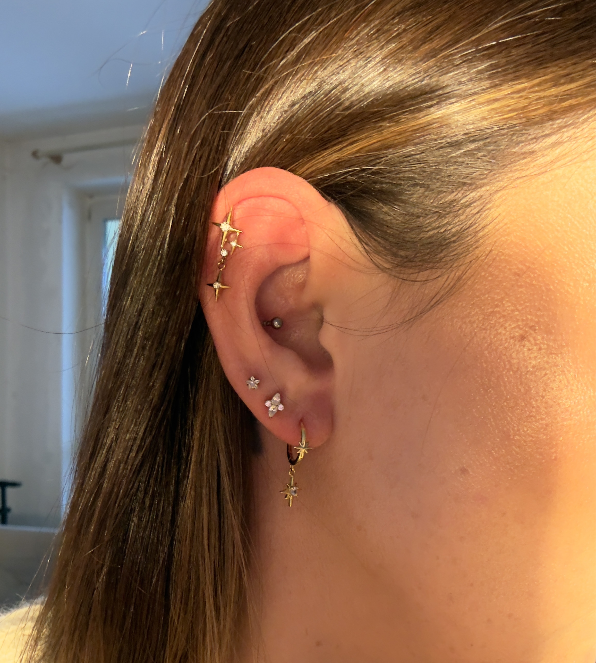 Pręt kolczyka wykonany jest z tytanu G23, cenionego za odporność na korozję i przyjazność dla skóry. Naturalny wariant srebrny zachowuje industrialny połysk tytanu, a wersja złota olśniewa dzięki powłoce PVD, która nie ściera się nawet przy intensywnym użytkowaniu. Gładki pręt z gwintem wewnętrznym łatwo się czyści, a płaska stopka z tyłu utrzymuje niski profil, by nie haczyć o czapki, szaliki ani opaski sportowe. Załóż go raz, a przy każdym uśmiechu dostrzeżesz subtelny błysk, który nadaje całej stylówce świeży, pewny vibe.