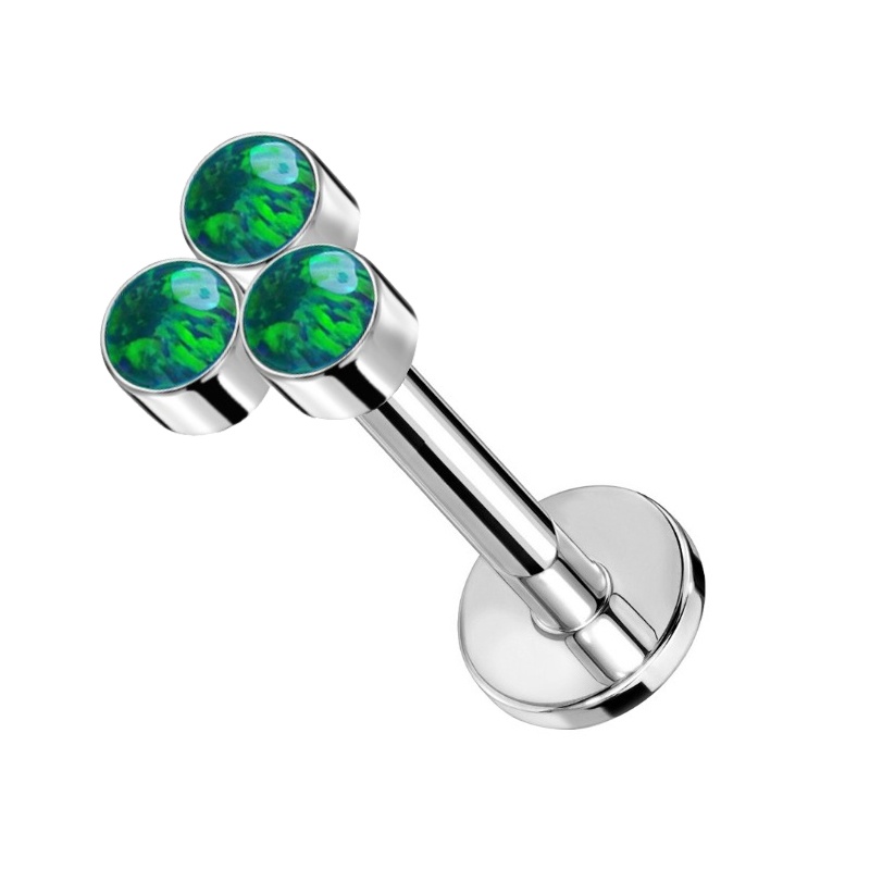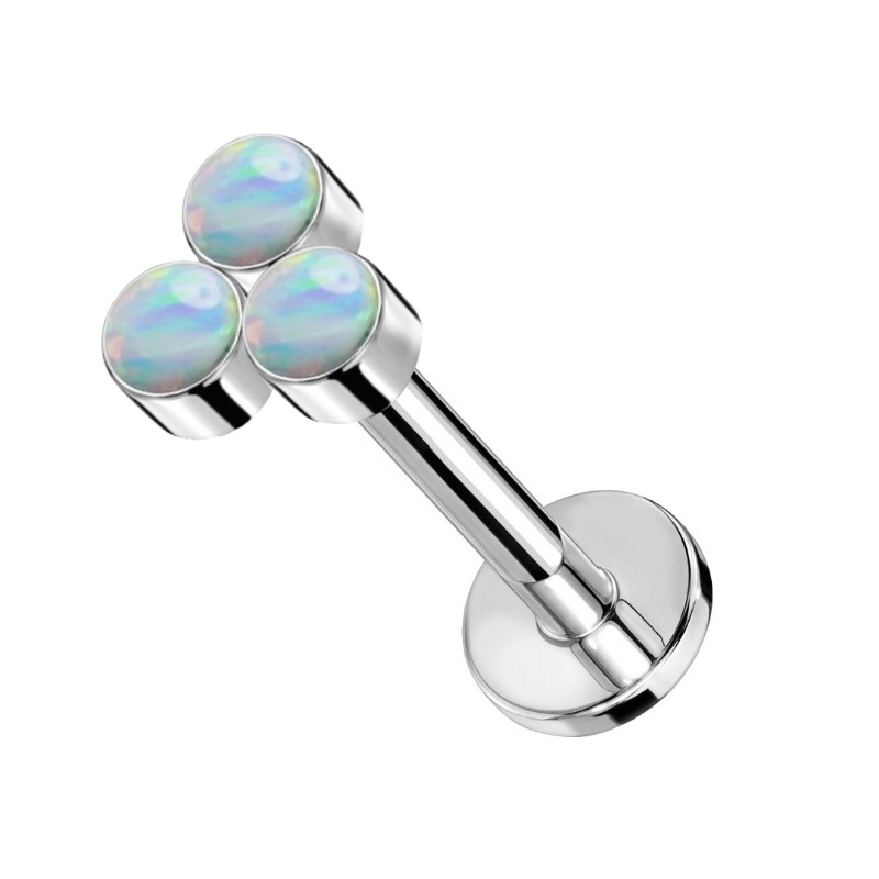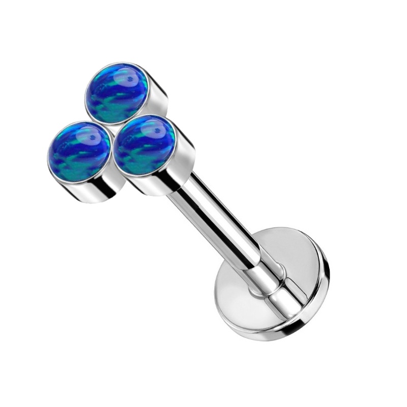 Opale układają się w subtelny klaster – każdy kolor ma swój niepowtarzalny urok – niebieski przywodzi na myśl głębię oceanu, biały błyszczy niczym poranna rosa, a morski odcień przypomina egzotyczne laguny. Pręt w srebrnym odcieniu to tytan G23: trwały i delikatny dla skóry, doceniany za komfort codziennego noszenia. Do tego gwint wewnętrzny, czyli gładkie wykończenie od środka: łatwiejsze zakładanie i nic nie haczy.