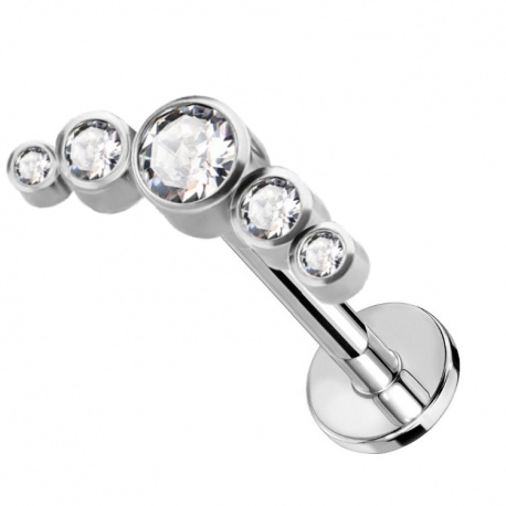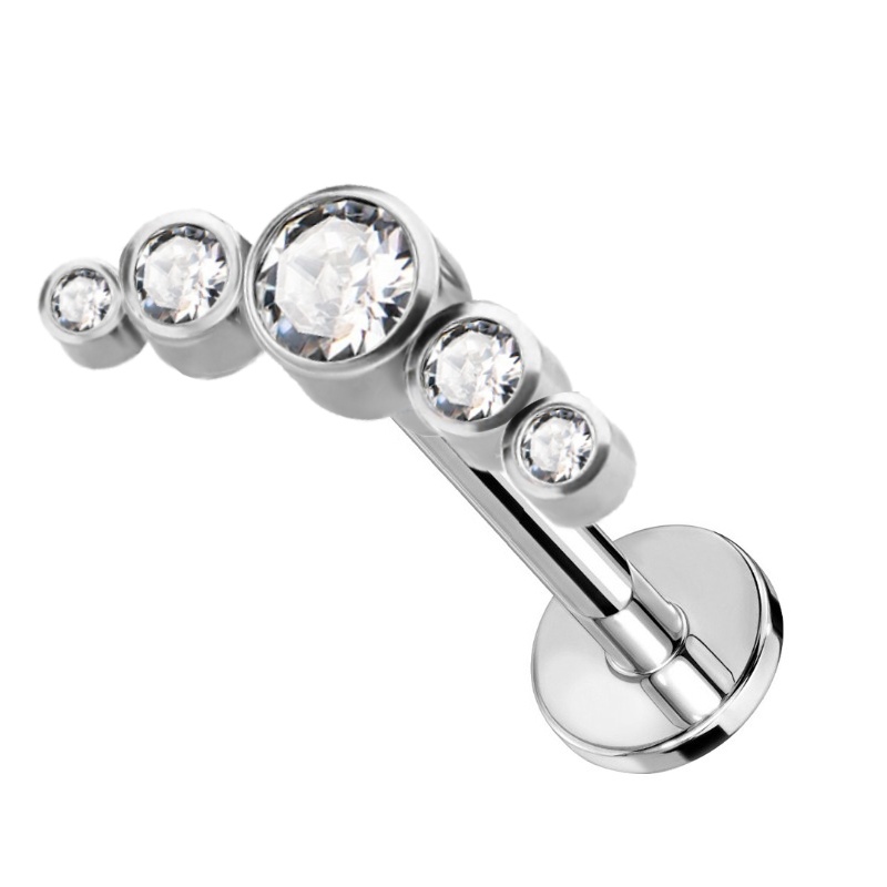 Labret z dużym clusterem pięciu kryształków to biżuteria, która daje efekt scenicznego blasku. Kamienie ułożone w delikatny łuk tworzą kompozycję, która działa jak reflektor – jeden ruch wystarczy, by rozświetlić całą stylizację. Dzięki temu kolczyk wygląda nowocześnie i wyróżnia się, nie tracąc przy tym elegancji.