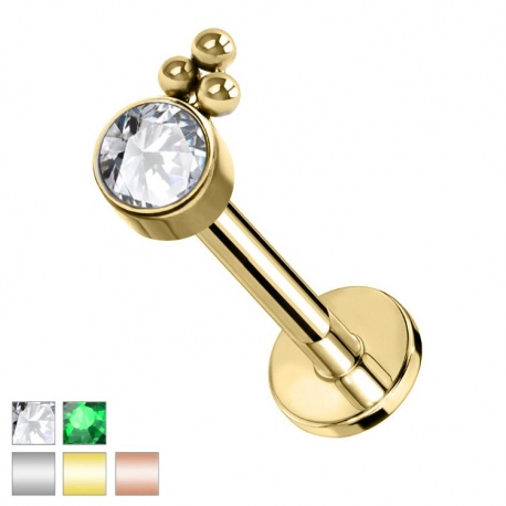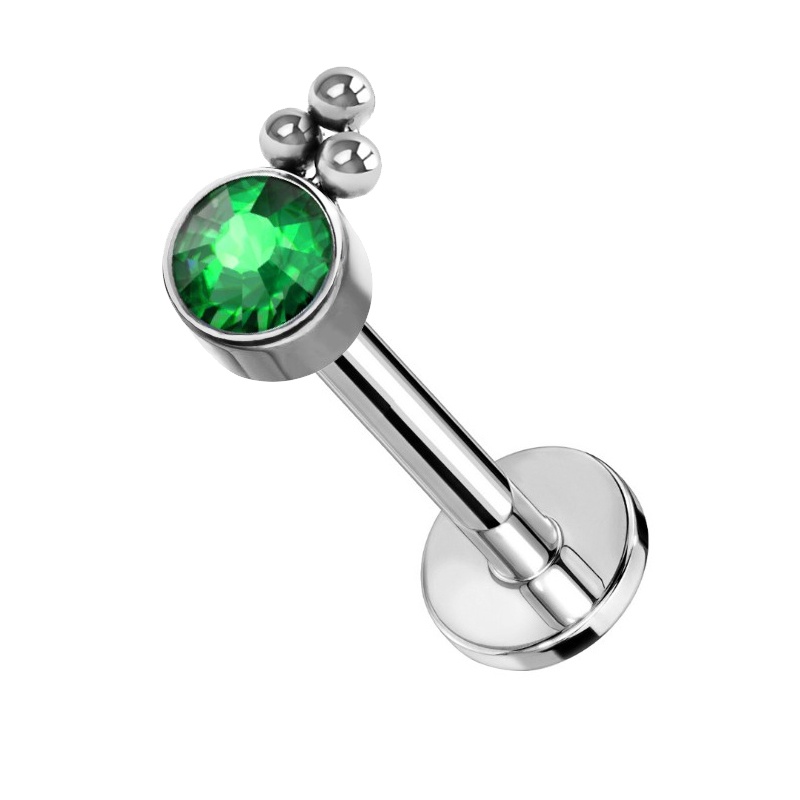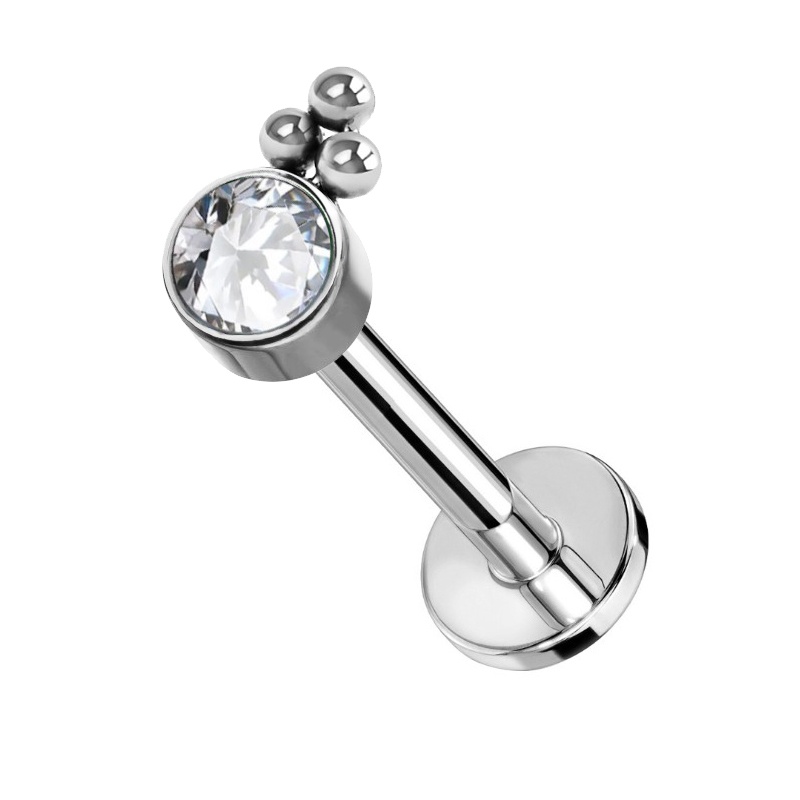 Przejrzysty kryształ gra tu z trio drobnych kulek — jak pinezka na mapie: wyznacza punkt odniesienia, a reszta kompozycji ustawia się pod ten akcent. Pręt wykonano z tytanu G23 – lekkiego i odpornego na korozję, znanego w piercingu z solidnych właściwości materiału. Model posiada gwint wewnętrzny.