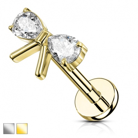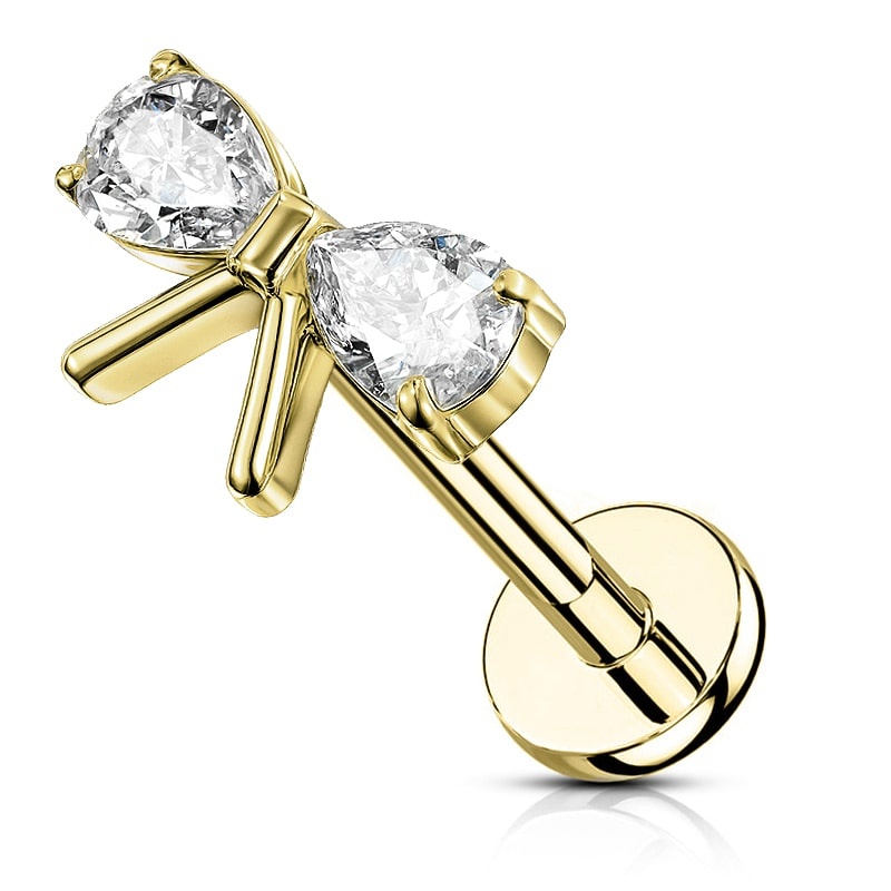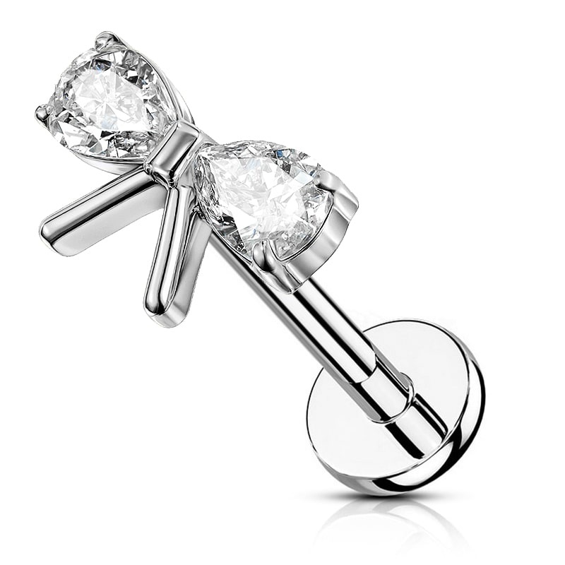 Dwie połyskujące „pętle” z kryształków i smukłe, metaliczne ogonki tworzą kokardkę, która wygląda jak wstążka przewiązana światłem. Baza z tytanu G23 jest lekka i wyjątkowo trwała, a przy tym delikatna dla skóry, więc możesz nosić kolczyk na co dzień bez kompromisów. Precyzyjny gwint wewnętrzny prowadzi biżuterię gładko, minimalizując ryzyko zahaczeń i ułatwiając szybkie przełożenie.