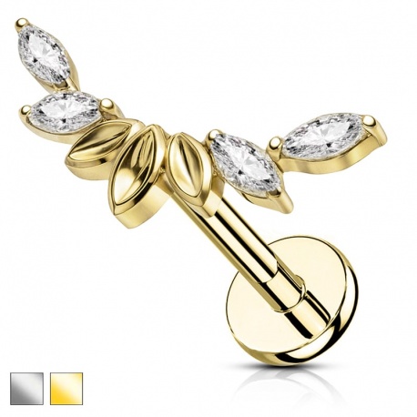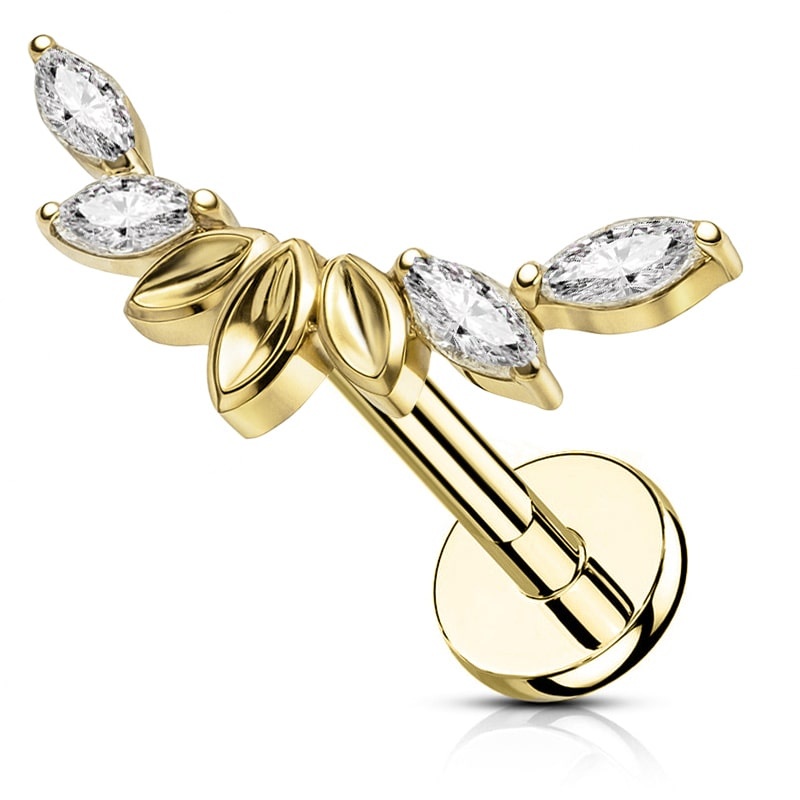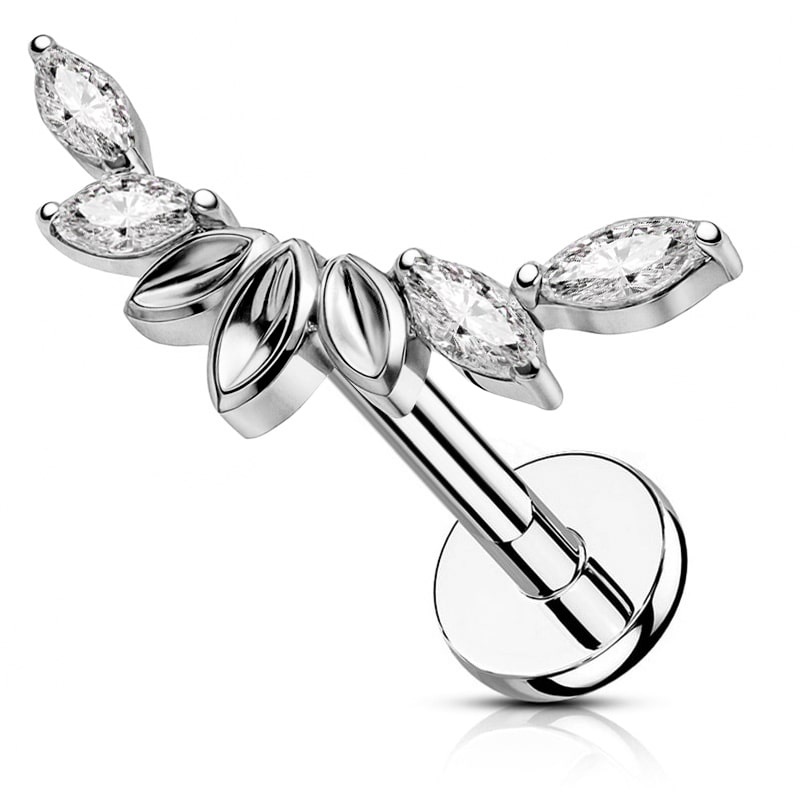 Gwint wewnętrzny prowadzi pręt gładko, bez haczenia o przekłucie, a płaski dysk z tyłu trzyma kolczyk stabilnie. Połysk markiz przypomina muśnięcie rozświetlacza – subtelny, ale zdecydowany – dzięki czemu labret świetnie sprawdza się solo i w zestawie. To detal, który dodaje pewności, łatwo łączy się z Twoją biżuterią i nie wymaga dodatkowych zabiegów, żeby wyglądać świeżo.