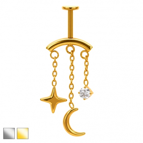 Z łagodnie wygiętej bazy zwisają trzy cienkie łańcuszki, a na nich księżyc, gwiazdka i błyszczący kryształek – tworząc efekt sfery niebieskiej zaczepionej na górnej chrząstce ucha. Kolczyk z gwintem wewnętrznym wykonano z tytanu G23, materiału trwałego i przyjaznego dla skóry, dlatego świetnie sprawdzi się przy długotrwałym noszeniu.