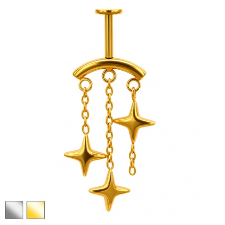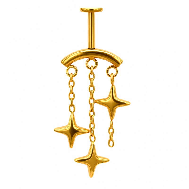Labret, który wygląda jak biżuteryjne trzy gwiazdki Michelina przyznane Twojej górnej chrząstce za styl. Na delikatnych łańcuszkach ułożone są trzy gwiazdki w różnych wysokościach, dzięki czemu przy każdym ruchu miękko się poruszają. Kolczyk wykonany jest z tytanu G23 z prętem o gwincie wewnętrznym – trwały, wygodny w noszeniu i łagodny dla wrażliwej skóry.