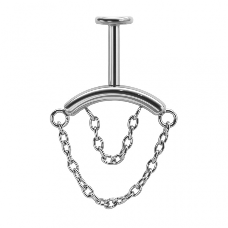 Labret, który wygląda jak nowy rozdział dnia w historii Twojej górnej chrząstki. Z wygiętego łuku spływają dwa delikatne łańcuszki – krótszy układa się bliżej ucha, dłuższy rysuje miękką linię niczym mini kolia. Całość wykonano z tytanu G23 z prętem o gwincie wewnętrznym, dzięki czemu kolczyk jest lekki, trwały i przyjazny dla wrażliwej skóry.