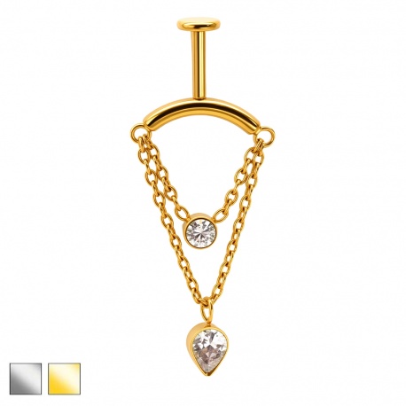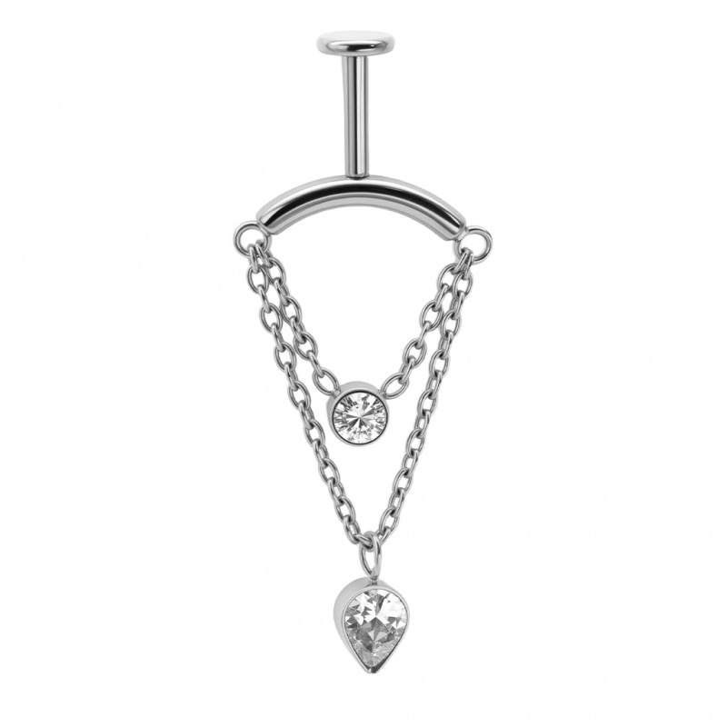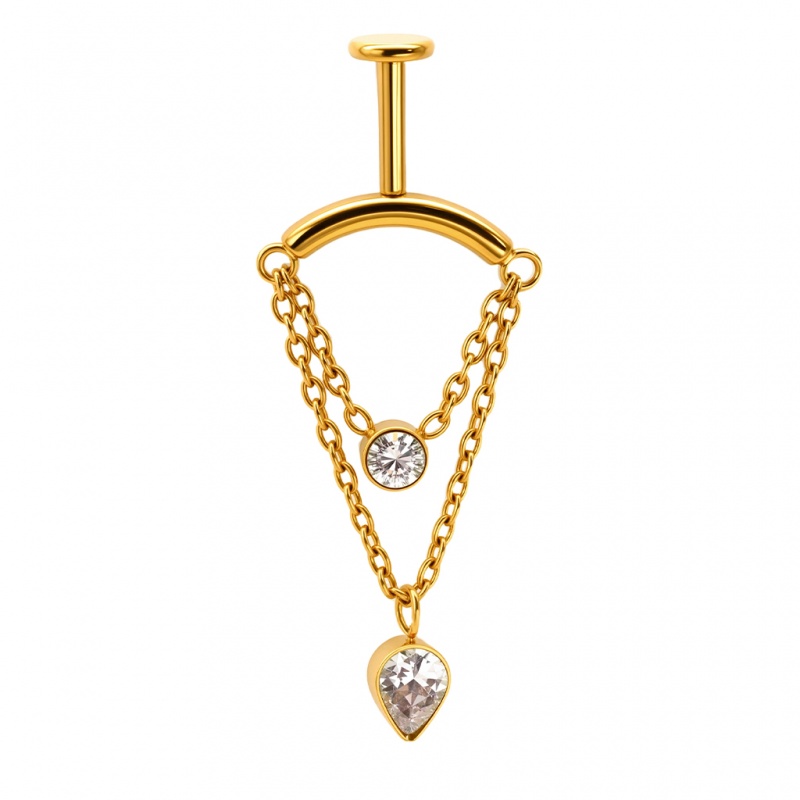 Kolczyk, w którym kryształowa łezka i jej mała świetlna towarzyszka tworzą duet jak dwie przyjaciółki, które zawsze ustawiają się razem na górnej chrząstce. Obie zawieszone są na delikatnych łańcuszkach, więc przy ruchu głowy miękko „rozmawiają” ze światłem, zamiast krzyczeć o uwagę. Podstawą jest tytan G23 i pręt z gwintem wewnętrznym, dzięki czemu biżuteria jest delikatna dla skóry, lekka i trwała.