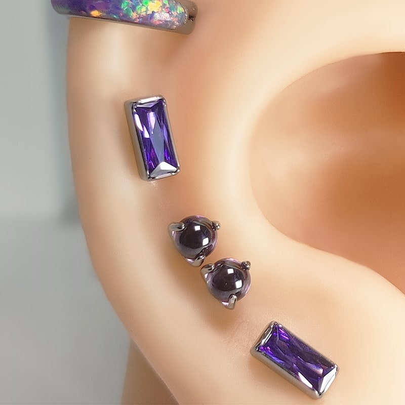 Kolor kryształka dobierasz pod swój klimat: kryształowy, czarny, zielony, niebieski albo fioletowy. Do tego dochodzi wybór wykończenia pręta i oprawy: srebrny (naturalny odcień tytanu) lub złoty uzyskany dzięki powłoce PVD. Ten model możesz nosić w niemal wszystkich przekłuciach ucha – w płatku i w chrząstce – jak w Tetrisie, kiedy trafiasz idealnym kształtem i wszystko nagle ma sens.