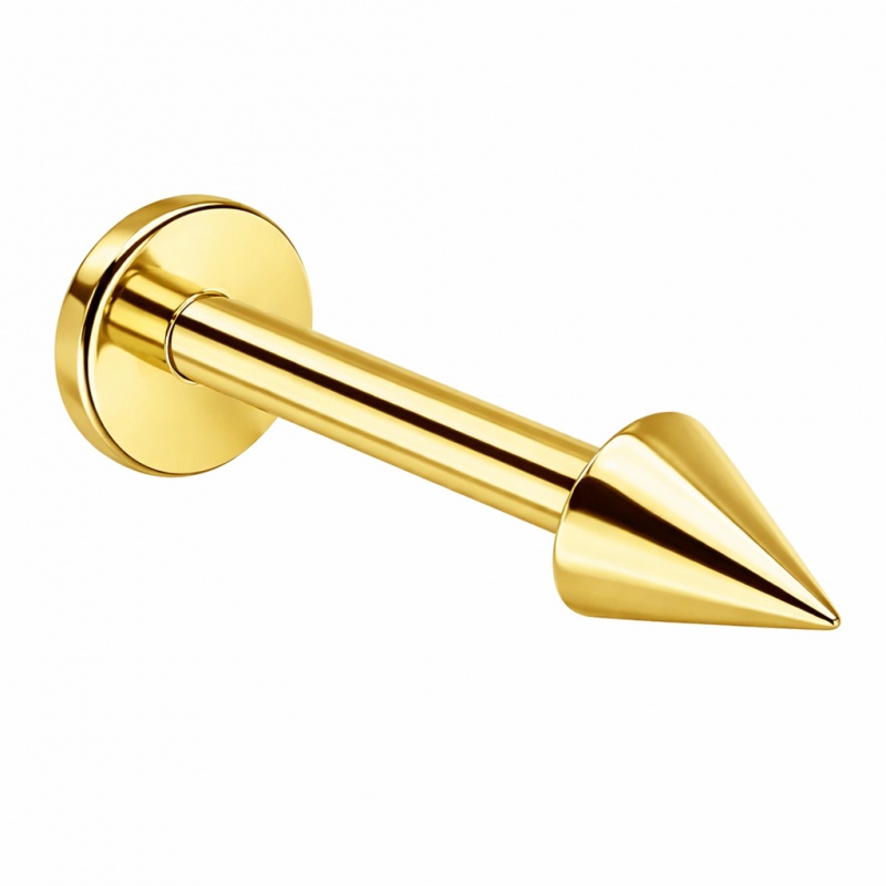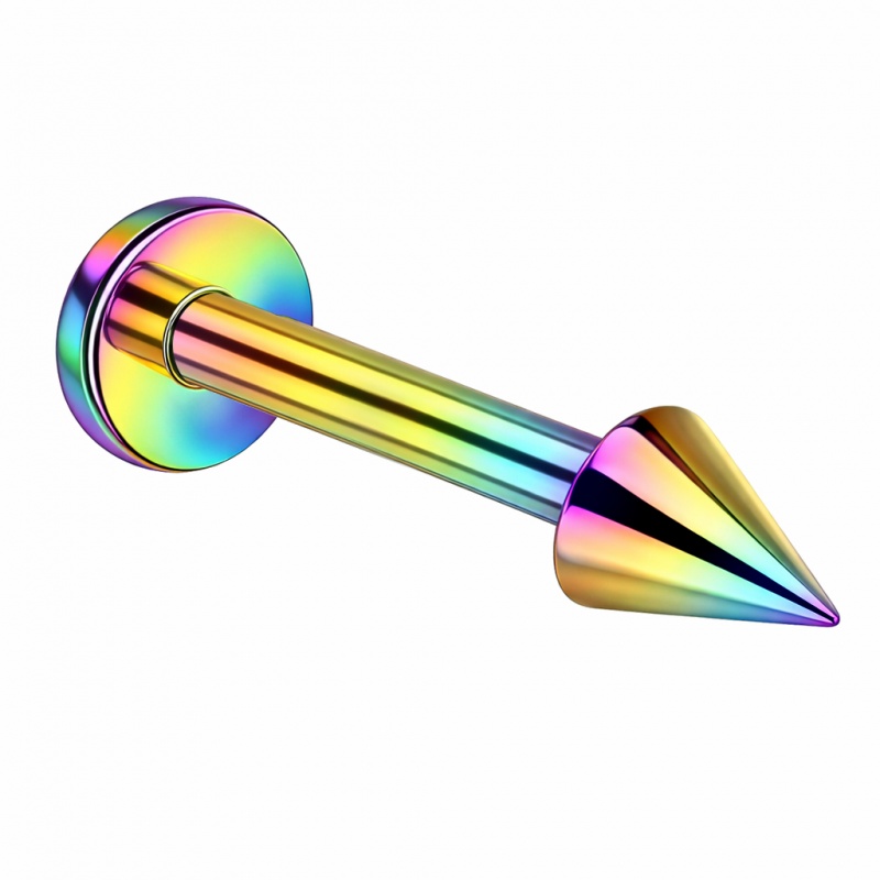 Srebrny wariant ma naturalny odcień tytanu, a kolorowe wersje (złoty, czarny, tęczowy) powstają dzięki powłoce PVD — to ona nadaje barwę i „zamyka” ją na powierzchni stożka oraz pręta. Od spodu dysk stabilizuje kolczyk, a gwint zewnętrzny ułatwia szybkie zakładanie i pewne dokręcenie stożka, żeby wszystko trzymało linię tak samo równo, jak wygląda.