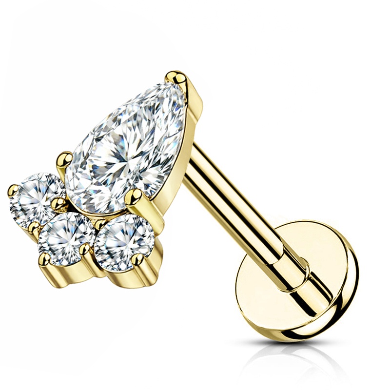 Forma łezki aż prosi się o dobre towarzystwo, dlatego tutaj obok niej pojawiają się trzy cyrkonie. Razem tworzą układ, który nie wygląda jak zwykła ozdoba, tylko jak mała kompozycja z własnym rytmem. Jest w tym coś z dobrze ułożonego znaku — jeden miękki kształt i trzy świetliste akcenty, które nadają całości wyraz i sprawiają, że chce się przyjrzeć jej jeszcze raz.