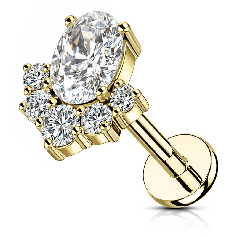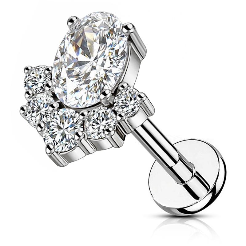 Owalna cyrkonia gra tu pierwszą rolę, ale cały urok tego modelu zaczyna się dopiero wtedy, gdy do głosu dochodzi pięć mniejszych. Gdy jeden owal to za mało, ten wzór rozpisuje ten sam motyw na sześć kamieni i właśnie w tym tkwi jego siła. Nie kończy się na jednym błyszczącym punkcie — daje więcej, bo powtarza owal w kilku miejscach i tworzy ozdobę, która od razu ma więcej treści. Bazą jest tytan G23, czyli materiał trwały, lekki i delikatny dla skóry.