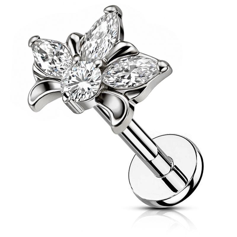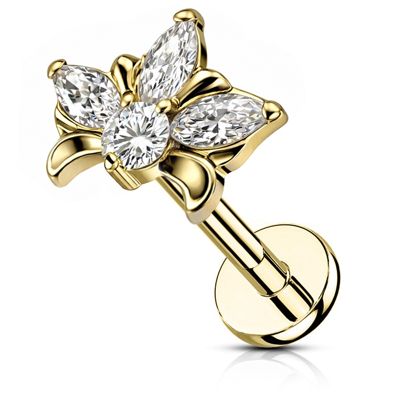 Labret wykonano z tytanu G23, czyli materiału trwałego, lekkiego i delikatnego dla skóry. Pręt ma gwint wewnętrzny, więc zakładanie jest wygodniejsze, a sam kolczyk dostępny jest w wersji srebrnej oraz złotej, w której kolor uzyskano dzięki trwałej powłoce PVD. To właśnie przekłucie staje się dla tego lotosu miejscem, w którym może rozkwitnąć w pełni.