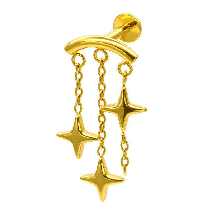 Zamiast wypatrywać szczęścia na nocnym niebie, miej je zawsze przy sobie w uchu. Ten labret to Twoja tytanowa gwiezdna trójka – trzy gładkie, wyraziste gwiazdki swobodnie spływające na drobnych łańcuszkach, niczym miniaturowy deszcz meteorów. Bazę wykonano z tytanu G23, dzięki czemu kolczyk jest łagodny dla skóry i na tyle lekki, że niemal zapomnisz, że masz go na sobie.