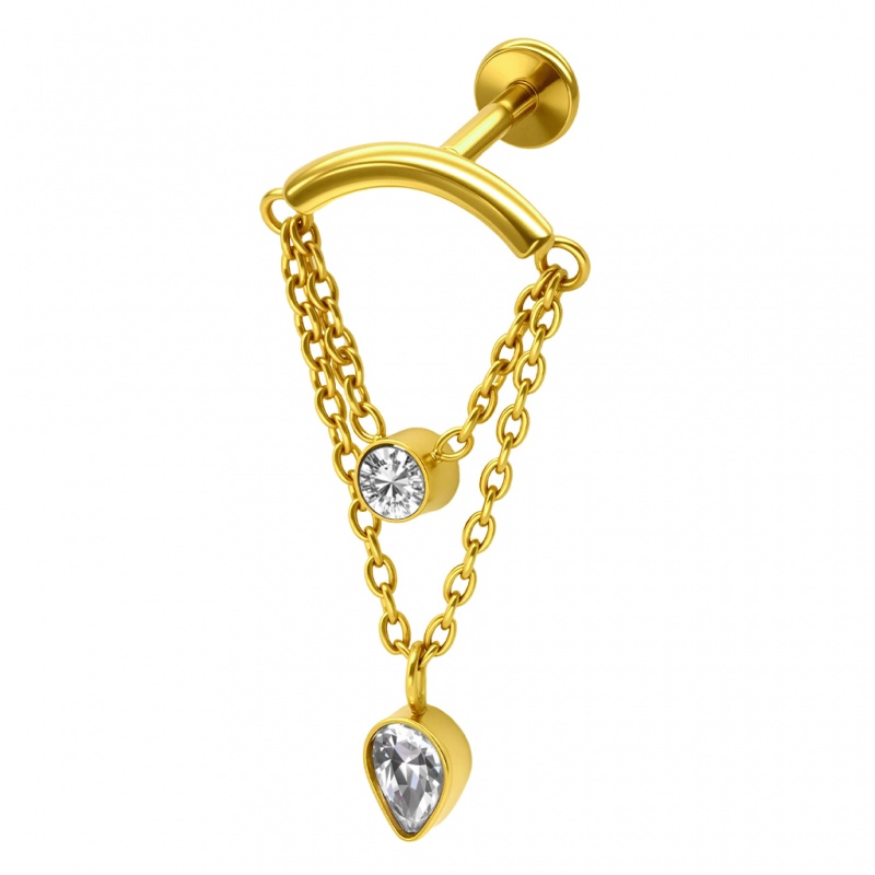 Ten labret to gra dwóch równoległych łańcuszków, z których każdy wnosi do kompozycji własny, lśniący detal. Pierwszy rząd ogniw przecina okrągła cyrkonia, podczas gdy drugi wieńczy zawieszona niżej cyrkonia w kształcie łzy – razem tworzą one w uchu dynamiczny, wspólny punkt blasku. Całość bazuje na tytanie G23, co gwarantuje lekkość i wyjątkową delikatność dla skóry.