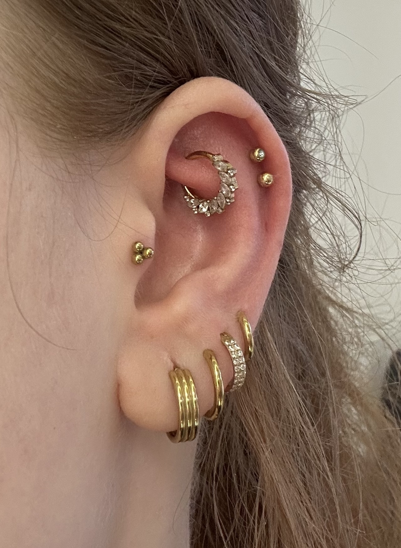 Potrójna kulka to subtelny, przestrzenny akcent, który ładnie rysuje kontur przekłucia w uchu czy brwi. Wykonana z tytanu G23, lekkiego i odpornego na korozję. Wersje czarna, rose gold i złota zawdzięczają kolor powłoce PVD, natomiast wersja srebrna to naturalny odcień tytanu. Gładkie wykończenie sprzyja komfortowi noszenia i nie haczy o włosy. Nakrętka pasuje do tytanowych kolczyków i prętów z naszej oferty – 1,2 mm, z gwintem wewnętrznym, więc bez trudu uzupełnisz swój zestaw. Wybierz rozmiar, który najlepiej zgrywa się z Twoją biżuterią – od delikatnego punktu, po wyraźniejszy akcent. Trwałość koloru utrzymuje się mimo codziennego użytkowania.