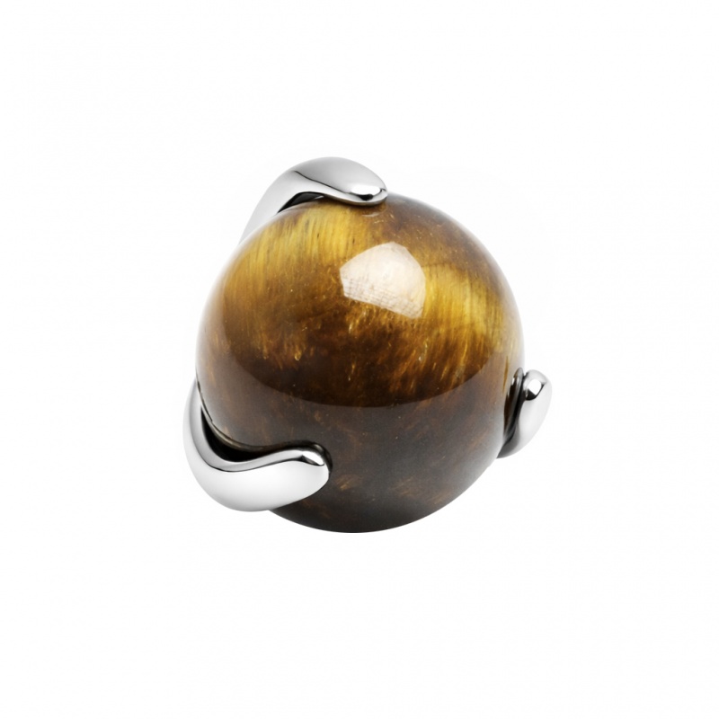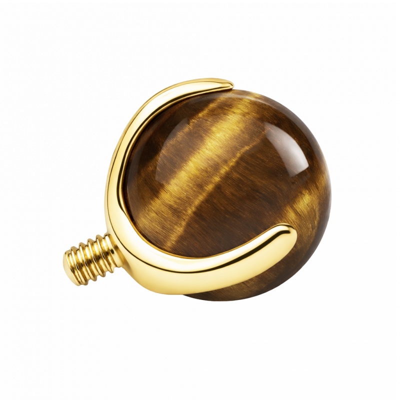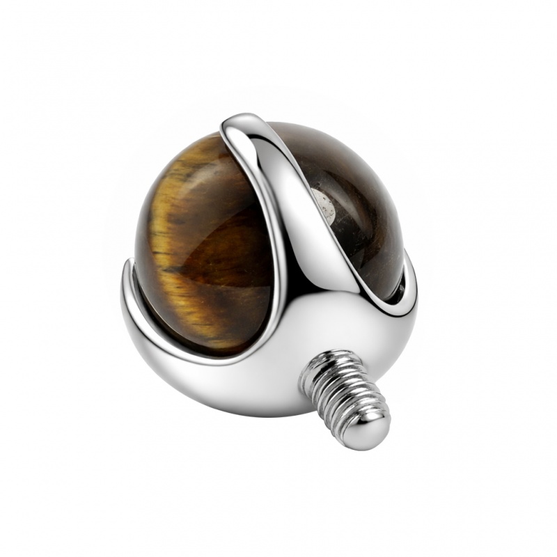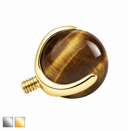 Ta nakrętka to kawałek natury: brązowe tygrysie oko w srebrnej oprawie z tytanu G23. Tytan jest lekki i odporny na korozję, więc nadaje się na codzienne noszenie i długo trzyma swój czysty połysk. Tygrysie oko to kamień naturalny, więc odcień może się lekko różnić między egzemplarzami — czasem będzie jaśniejszy, czasem głębszy (to jego naturalna cecha). Rozmiar ozdoby dobierasz pod siebie: 3 mm/4 mm, gdy chcesz bardziej subtelny detal, albo 5 mm, jeśli kamień ma być wyraźniej widoczny. Efekt? Wkręcasz nakrętkę raz, a natura podpisuje Twój piercing swoim własnym rysunkiem.