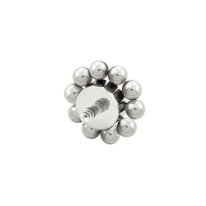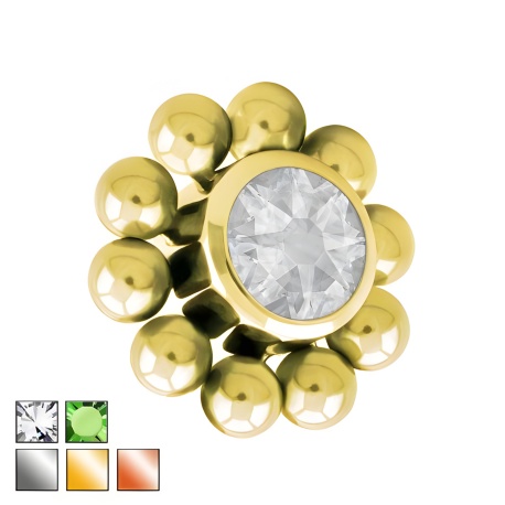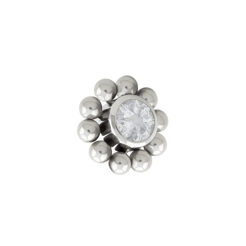 Kryształek jest w centrum, a dookoła ma kulkową eskortę – małe kulki „pilnują” go z każdej strony i robią z tego jedną, spójną całość. Nakrętka jest z tytanu G23, czyli materiału lekkiego, odpornego na korozję i przyjaznego dla skóry. Wersja srebrna to naturalny kolor tytanu, a złota oraz rose gold powstają dzięki trwałej powłoce PVD. Clear to totalny klasyk: przezroczysty kryształek wtapia się w styl i nie narzuca; zielony robi odwrotnie – daje wyraźniejszy punkt koloru bez zmiany całej biżuterii. Pasuje do tytanowych kolczyków i prętów z naszej oferty - 1,2 mm, z gwintem wewnętrznym – idealna, gdy chcesz podmienić samą końcówkę i zostawić bazę bez zmian.