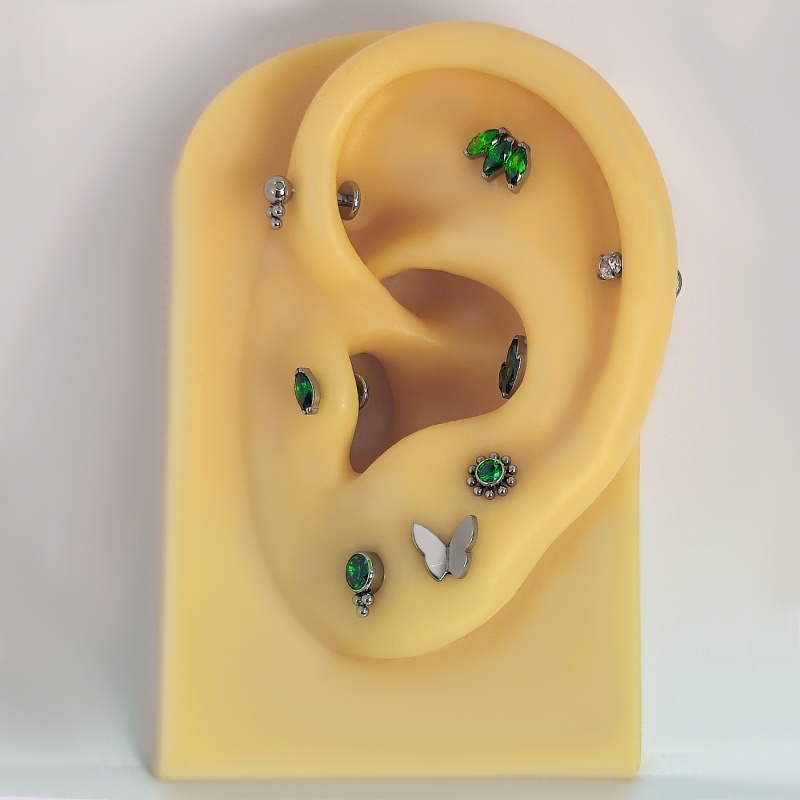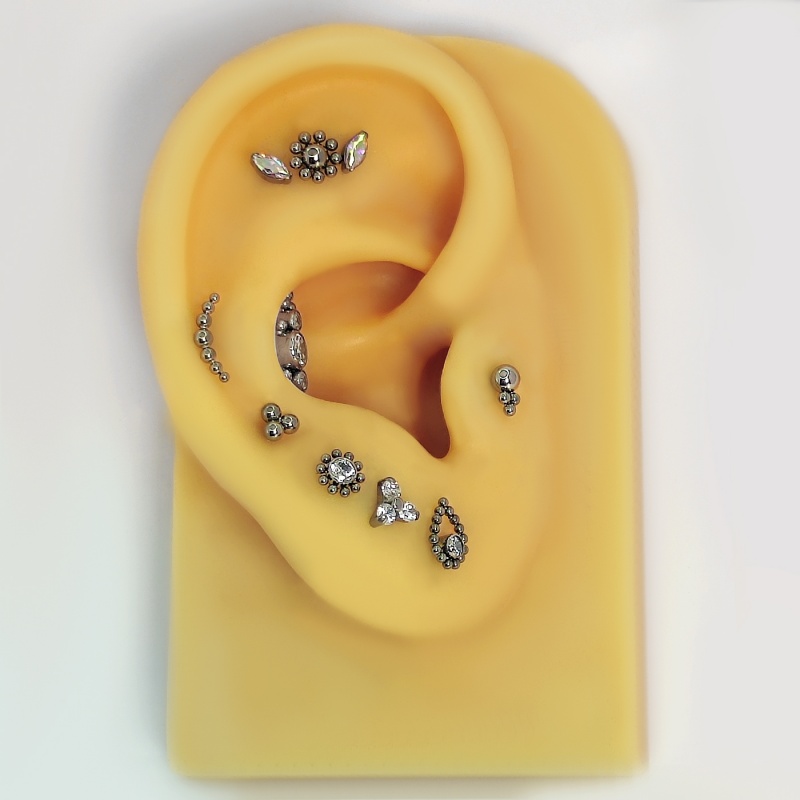 | Materiał | Tytan G23 - Ze względu na swoje właściwości medyczne często wykorzystywany jest do produkcji urządzeń medycznych (zastawki serca), czy protez ludzkiego ciała. Z tego względu jest również jednym z najlepszych materiałów do produkcji biżuterii. Zgodnie z dyrektywą unijną (Nickel Directive) kolczyki z tytanu są szczególnie polecane do świeżego przekłucia oraz osobom posiadającym uczulenie na nikiel. |