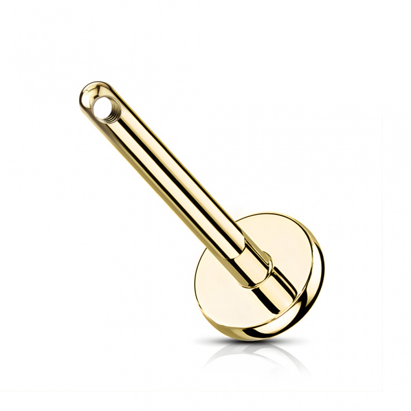 Ten pręt typu labret to solidna baza z tytanu G23, często wybieranego przy wrażliwej skórze. Ma płaski dysk, który dobrze przylega, a ozdobę wkręcasz z boku – nie od góry. To ważne rozwiązanie m.in. przy przekłuciu vertical helix, bo pozwala ustawić końcówkę dokładnie tak, jak chcesz. Do pręta 1,2 mm możesz wkręcić różne nakrętki z gwintem zewnętrznym, dzięki czemu łatwo zmieniasz ozdoby bez wymiany całego pręta. Gwint wewnętrzny pomaga wkręcać końcówki płynnie i komfortowo. Wariant srebrny jest w naturalnym kolorze tytanu, natomiast wariant złoty ma złoty odcień dzięki powłoce PVD.