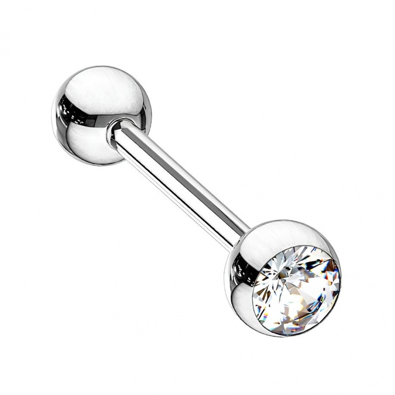 To nadal klasyczna sztanga do języka, ale z jednym detalem: kryształek w kulce przełamuje gładką, stalową końcówkę. Kolczyk wykonano ze stali chirurgicznej 316L — trwałej, odpornej na korozję i łatwej w pielęgnacji, więc to solidna baza do codziennego noszenia.