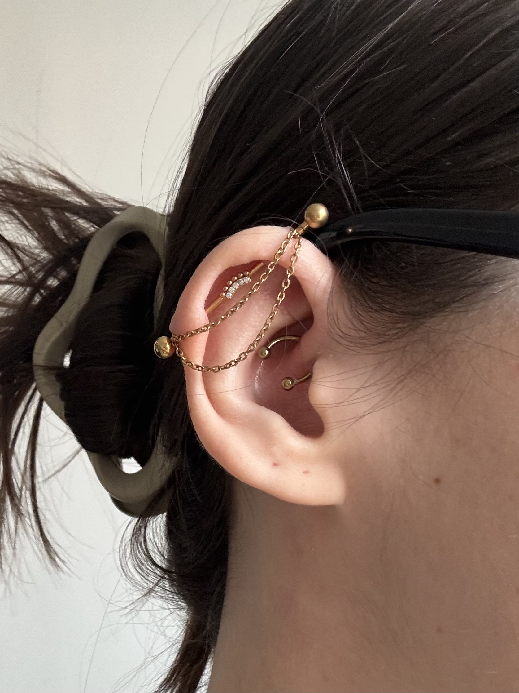 Ten kolczyk zachwyca unikalną ozdobą w postaci subtelnego kryształowego łuku, który został dodatkowo ozdobiony drobnymi tytanowymi kuleczkami. Industrial jest wykonany z najwyższej jakości tytanu klasy G23, jest lekki i wytrzymały, a jednocześnie bezpieczny dla skóry. To idealny wybór dla osób, które szukają biżuterii wolnej od niklu i podrażnień. Kolor złoty uzyskany dzięki zastosowaniu powłoki PVD.